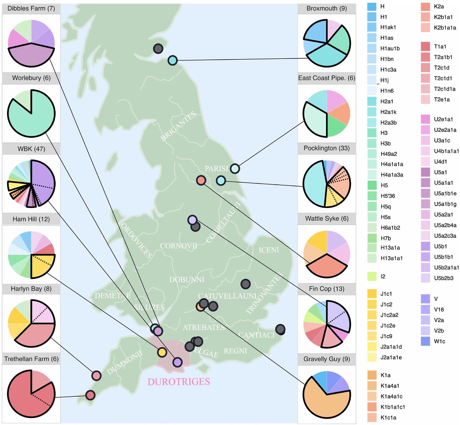 remaining 12 sites. Haplogroups with a count above one are emphasised with a black outline in the pie charts. Dotted lines are used to split haplogroups into downstream subclades based on additional mutations. Iron Age tribe names recorded by classical writers and their approximate geographic locations are shown. The haplotypes of all British Iron Age samples used in this analysis are given in Supplementary Table 12.