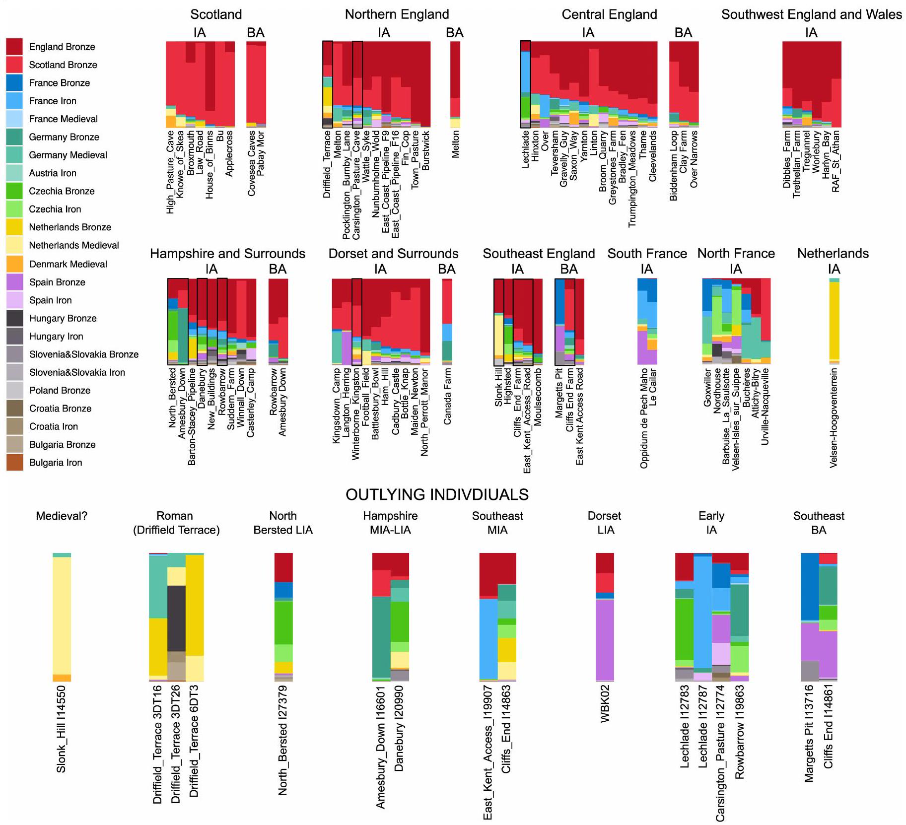 deviations below the population mean). The bottom row shows ancestry profiles for these outlying genomes. We note that all Middle and Late Iron Age outliers derive from the channel core region. We identify two previously reported