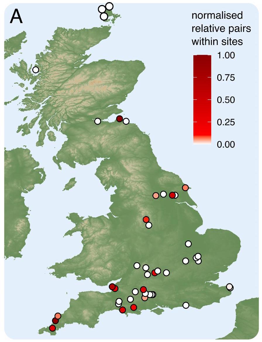 تشمل المجموعات مواقع بريطانية قارية وساحلية، مما يشير إلى حركات عبر القناة.