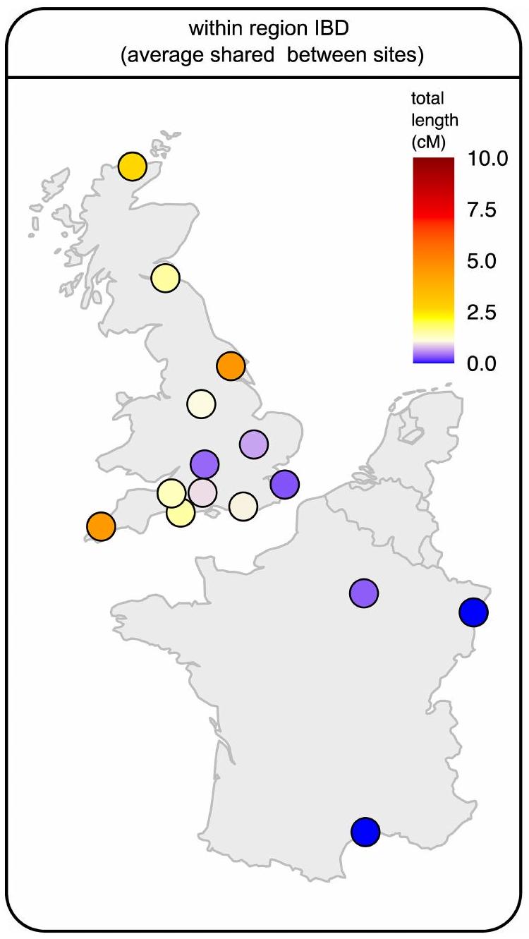 kinship and cultural practices such as consanguineous marriage. We see lowest values for within region IBD sharing in France and the southeast of England. For within genome IBD sharing, we take the population average of the total length of runs of homozygosity for each archaeological site. If the average total length is above 3 cM we plot the site in the bottom panel. In Britain, sites with reduced runs of homozygosity (top panel) are concentrated in south central and southeastern regions indicative of larger population sizes. Within site IBD sharing (average length shared between individuals in a site) is plotted in a similar fashion.