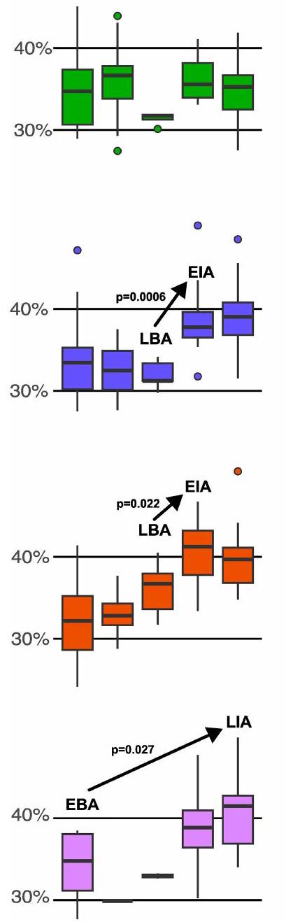 values for different 500-year time bins for each region. These bins are demarcated with grey dashed lines on the rolling average plot. Time bin date ranges are labelled with respect to the approximate archaeological period they centre on (EBA:Earlier Bronze Age, MBA: Middle Bronze Age, LBA: Later Bronze Age, EIA:Earlier Iron Age, LIA: Later Iron Age). Significant changes (Welch’s