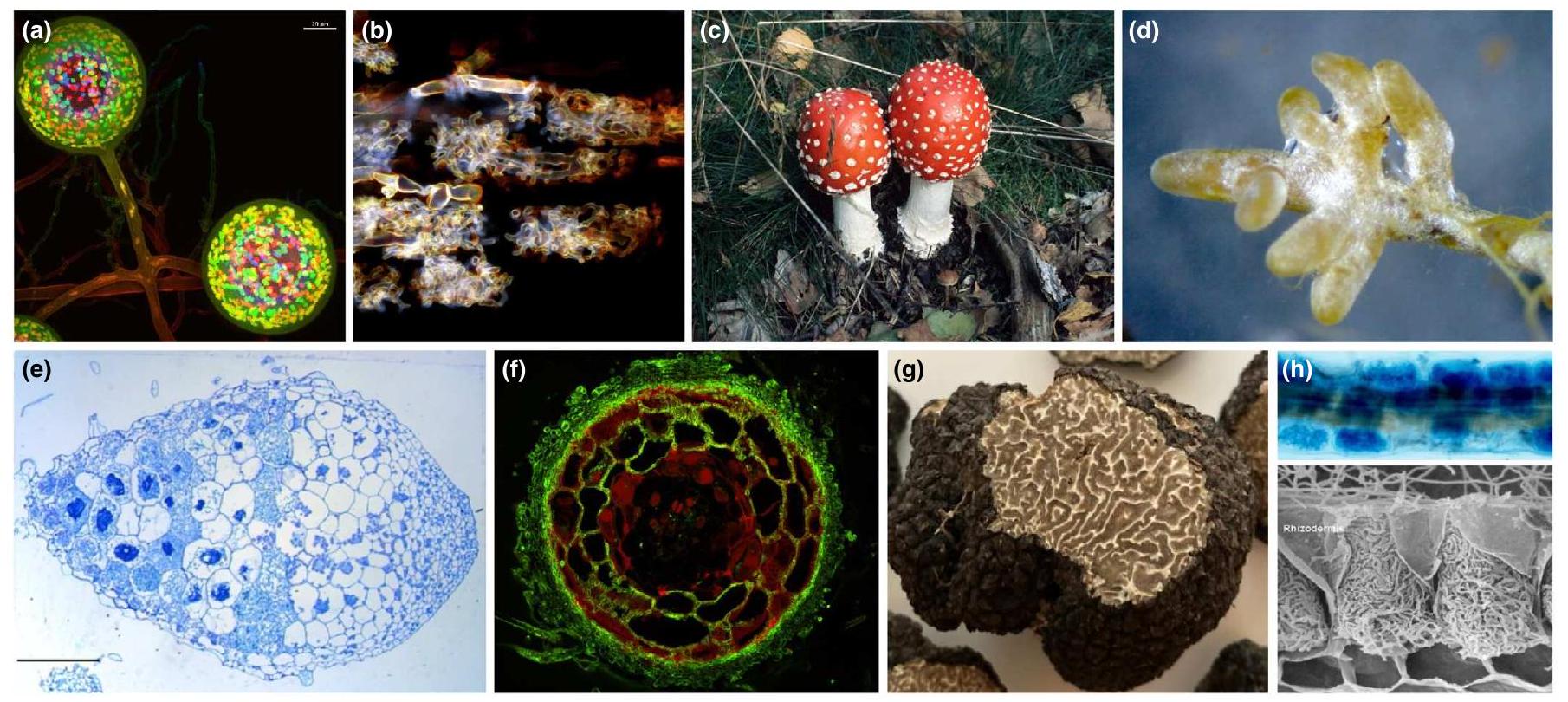 ; صورة مقدمة من مايرا دي فريتاس بيريرا (INRAE)). (g) جسم الثمرة للفطر الترفل Tuber macrosporum؛ صورة مقدمة من جانيس روجينموسر (جامعة زيورخ). (h) نظرة عامة على خلايا جذور Erica carnea المستعمرة بواسطة خيوط فطر الميكوريز الإريكويد الملونة باللون الأزرق (اللوحة العلوية)، وصورة مجهر إلكتروني تظهر خلايا Pyrola minor التي تحتوي على عدد كبير من خيوط الفطر التي تشكل الكتل؛ صورة مقدمة من روزماري هونجر (جامعة زيورخ).