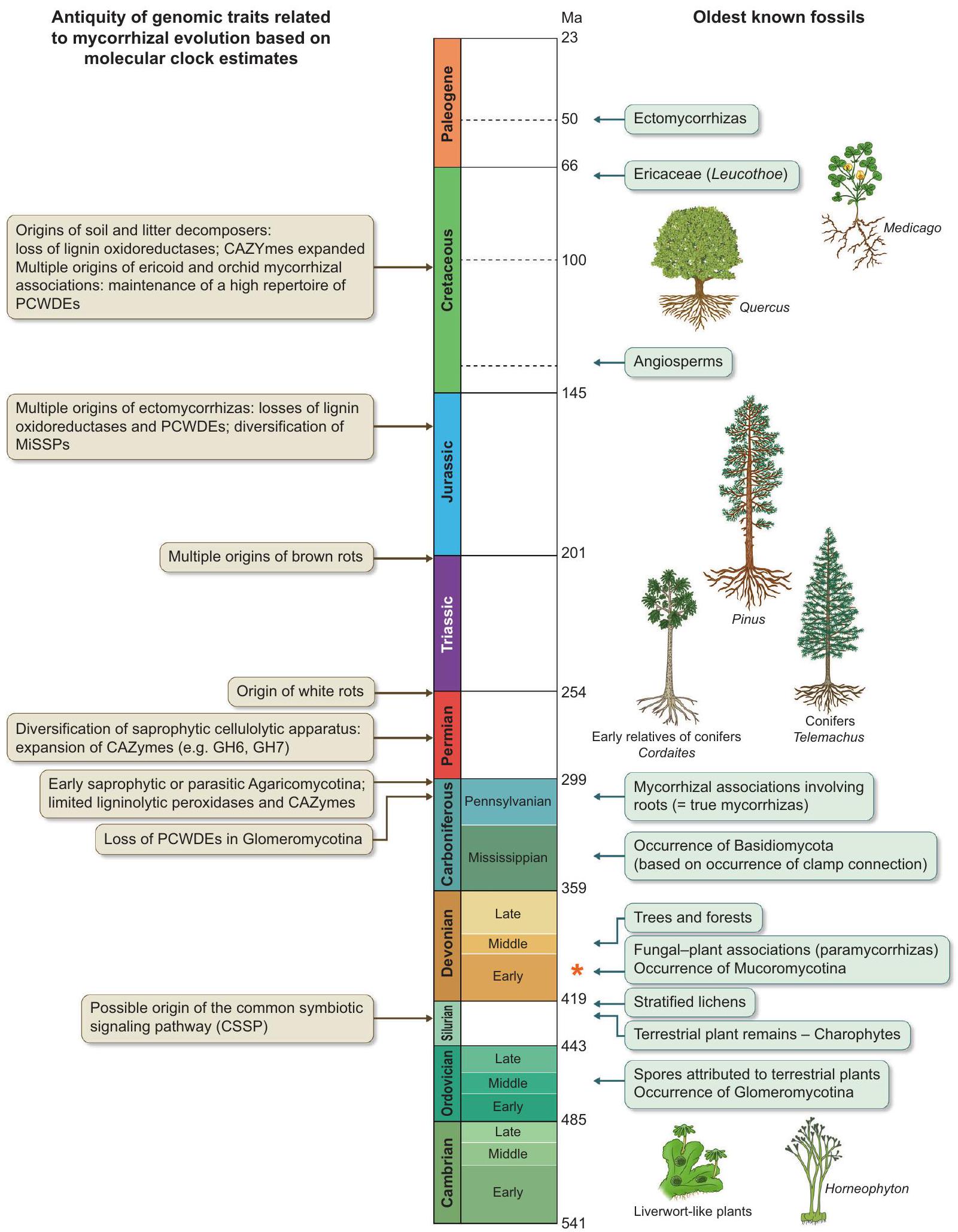 الشكل 2 ظهور السمات الجينومية التعايشية الرئيسية المتعلقة بتطور التعايش الميكوريزي (يسار) بناءً على تقديرات الساعة الجزيئية على طول المقياس الزمني الجيولوجي/العصور الجيولوجية من الكامبري إلى الباليوجيني (الوسط) مع أقدم الحفريات المعروفة (يمين). يمثل النجم البرتقالي تشكيل شرت ريني في 407 مليون سنة. تُظهر الرسوم التوضيحية للنباتات الأرضية المبكرة (نباتات شبيهة بالكبد، هورنيوفيتون)، الأقارب الأوائل للصنوبريات (كورداتيس)، الصنوبريات (تيليماخوس، بينوس)، والنباتات المزهرة (كواركوس، ميدicago). CAZymes، إنزيمات نشطة على الكربوهيدرات؛ GH، جليكوزيل هيدراز؛ MiSSPs، بروتينات صغيرة سرية مستحثة بالميكورزا؛ PCWDEs، إنزيمات تحلل جدران خلايا النباتات. تم التكيف من سترو-ديرين وآخرون (2018).