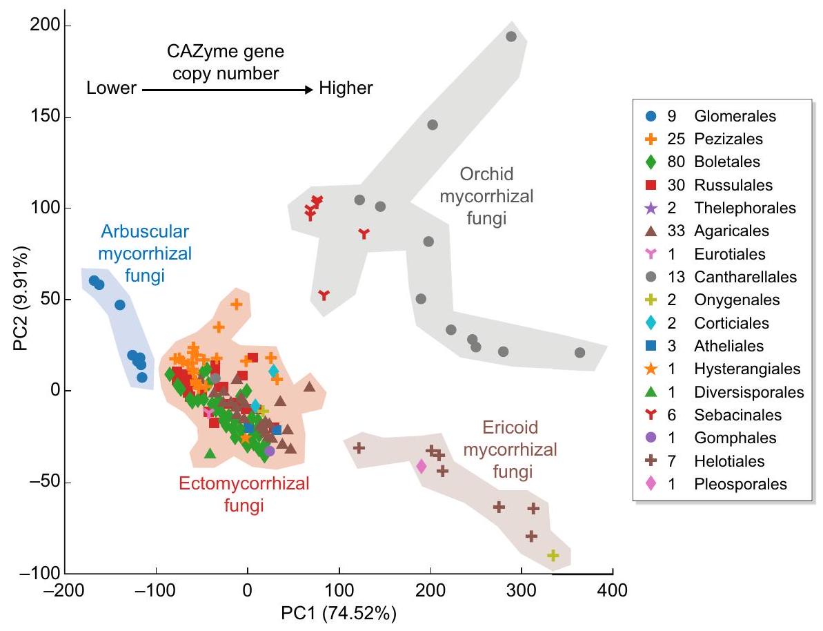 الشكل 3 التوزيع التفاضلي لعدد نسخ الجينات لجينات CAZyme التي تعمل على البوليسكاريدات الميكروبية والفطرية والنباتية ومشتقات اللجنين في جينومات 217 نوعًا من الفطريات الميكوريزية الجذرية، والفطريات الميكوريزية الخارجية، والفطريات الميكوريزية الأوركيدية أو الفطريات الميكوريزية الإريكية ذات البيئات المتباينة. تم تحديد تحليل المكونات الرئيسية لعدد نسخ جينات CAZyme الكلي الموجودة في الفطريات الميكوريزية الجذرية، والفطريات الميكوريزية الخارجية، والفطريات الميكوريزية الإريكية، والفطريات الميكوريزية الأوركيدية. كل رمز يتوافق مع جينوم نوع من الأنواع الميكوريزية المتاحة في قاعدة بيانات JGI MycoCosm (mycocosm.jgi.doe.gov). يتم الإشارة إلى الترتيب التصنيفي للأنواع المتسلسلة بواسطة رموز ملونة مختلفة كما هو موضح في الأسطورة (اللوحة اليمنى). لاحظ التوزيعات المتباينة في مجموعات جينات CAZyme في أنماط الحياة الميكوريزية المختلفة مع زيادة مجموعة جينات CAZyme من الفطريات الميكوريزية الجذرية (السفلى) إلى الفطريات الميكوريزية الإريكية (العليا؛ من اليسار إلى اليمين). تم إجراء تحليل المكونات الرئيسية (PCA) باستخدام أداة MycoCosm PCA (mycocosm.jgi.doe.gov). تم الحصول على مجموعات جينات CAZyme بعد تنسيق شبه يدوي لتسلسلات البروتين بواسطة فريق CAZy (www.cazy.org) (Drula et al., 2022).