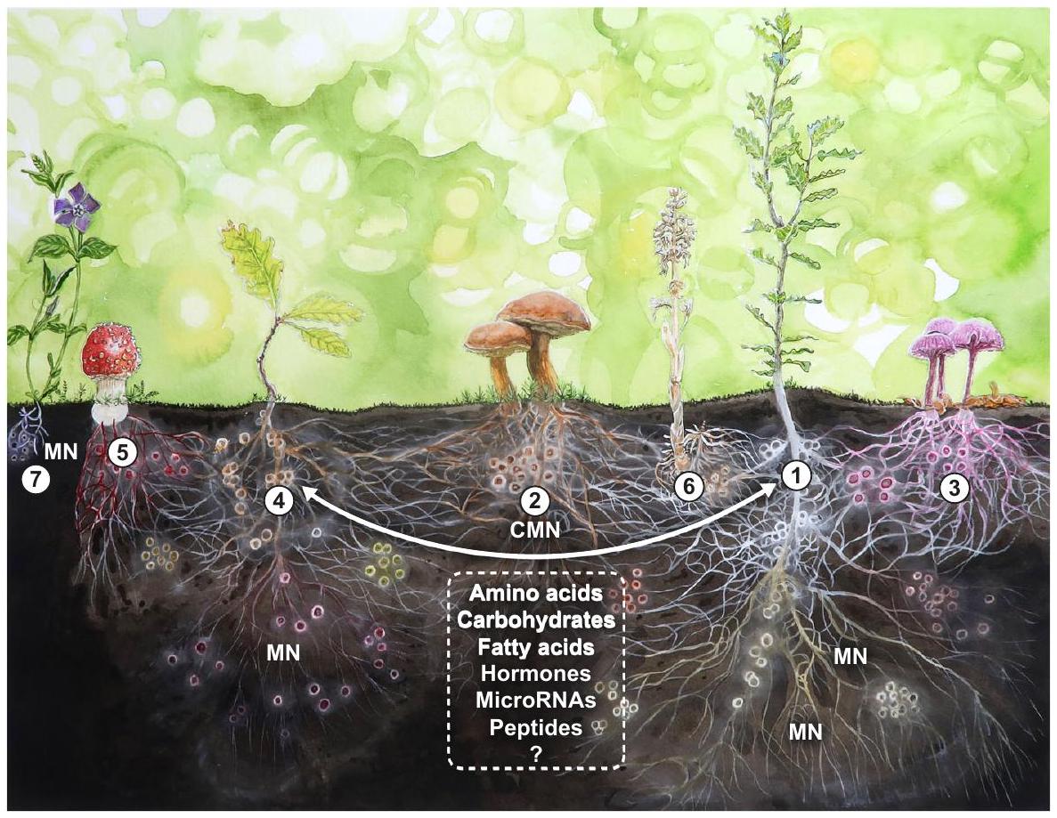 الشكل 4 عرض لمجتمع التربة الفطرية في غابة افتراضية تهيمن عليها أنواع البلوط المرتبطة بأنواع مختلفة من الفطريات الميكورايزية التي تشكل شبكات تحت الأرض منفصلة (MN) قد تستخدم لنقل الأحماض الأمينية، والكربوهيدرات، والأحماض الدهنية، والميكروRNAs الإشارية أو الببتيدات والهرمونات. يشكل بلوط دائم الخضرة (Quercus ilex) (1) جذور ميكورايزية خارجية وشبكات فطرية مع Xerocomellus chrysentheron (البوليت الأحمر المتشقق) (2) وLaccaria amethystina (المخادع الأرجواني) (3)، بينما يؤسس بلوط ثابت (Quercus petrea) (4) ميكورايزا خارجية (ECM) وشبكات فطرية مع Xerocomellus chrysentheron (2) وAmanita muscaria (5). تظهر جذور ECM كنقاط ملونة على أنظمة الجذر. تربط شبكات X. chrysentheron بين Q. ilex وQ. petrea من خلال شبكة فطرية مشتركة (CMN). تتطفل الأوركيد غير الضوئية Neottia nidus-avis وشبكتها الفطرية (ORM) (6) على شبكة الميكورايزا للبلوط الدائم الخضرة. يتم استعمار البيروينكل الأصغر (Vinca minor) بواسطة AMF، مما يشكل شبكة ميكورايزية مستقلة (7). تمثل الألوان المختلفة شبكات فطرية ميكورايزية مختلفة، مع جذور ECM كنقاط من نفس اللون. لاحظ أن تركيبات أخرى ممكنة (مثل الغابات الشمالية التي تحتوي على أشجار ECM غالبًا ما تحتوي على طبقة تحتية من الشجيرات (مثل Vaccinium) التي تشكل ارتباطات ميكورايزا إريكويدية (ERM)؛ توضيح بفضل فلوريان غادين).
