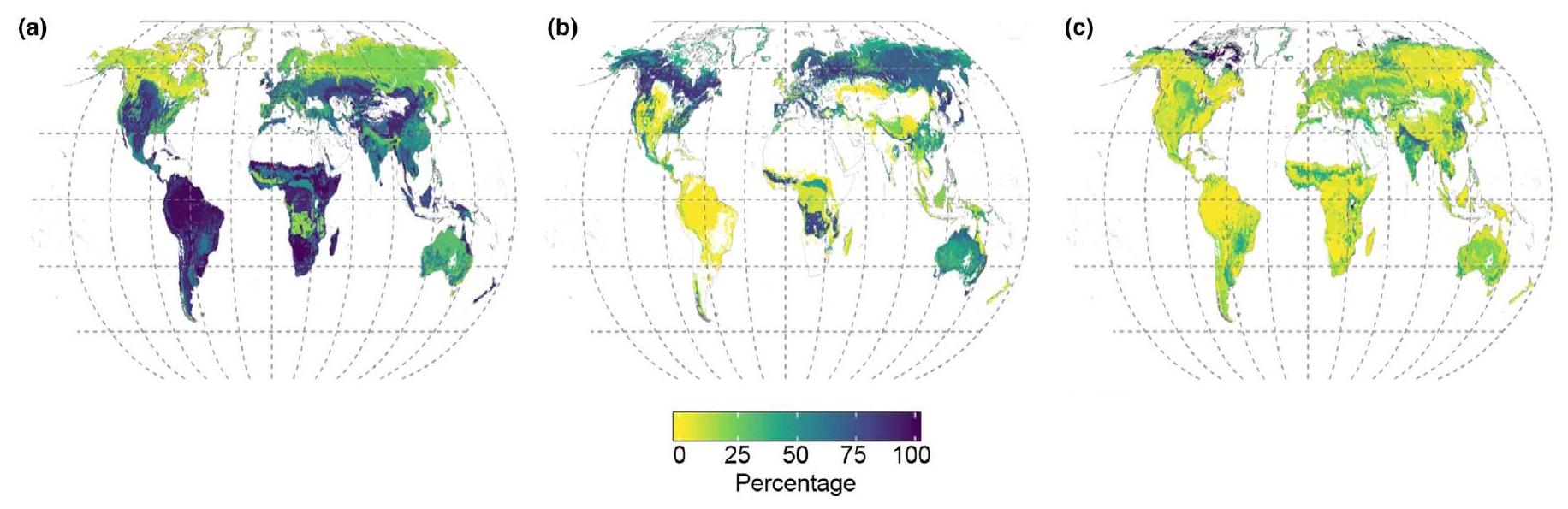 Fig. 5 Global map of the percentage of total aboveground plant biomass linked to the different mycorrhizal categories. (a) arbuscular mycorrhizal plants; (b) ectomycorrhizal plants; (c) nonmycorrhizal plants. Map resolution was 10 arcmin. Published by Soudzilovskaia et al. (2019).