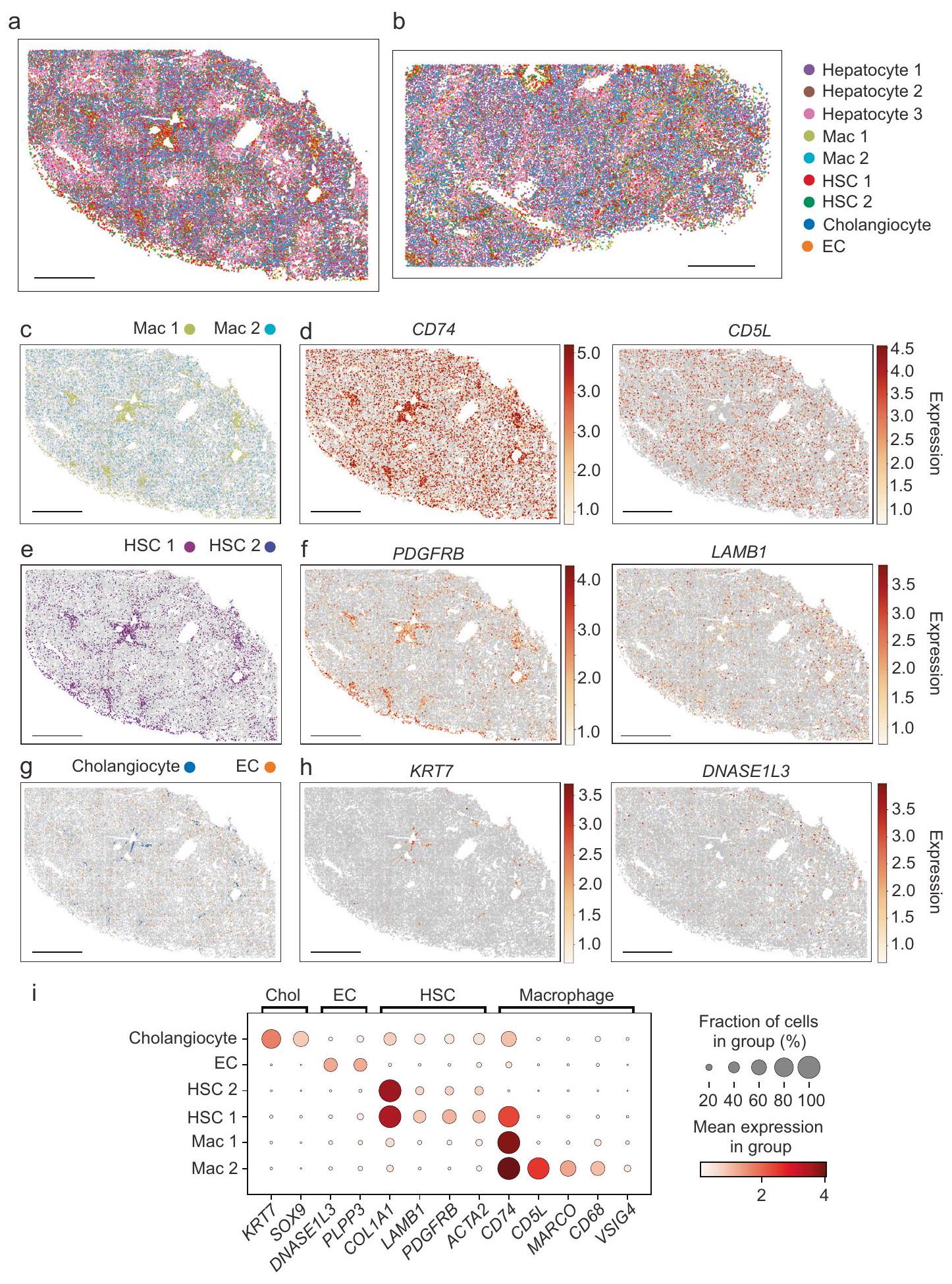 colored by the normalized expression of the indicated marker genes. CD74 and CD5L identify macrophages (d), PDGFRB and LAMB1 identify HSCs (f), KRT7 identifies cholangiocytes, and DNAS1L3 identifies ECs (h). Scale bars: . i Dot plot quantifying expression of genes that identify non-parenchymal cells in the liver. The size of the dot represents the percentage of cells expressing a specific gene, and the color intensity indicates mean expression.