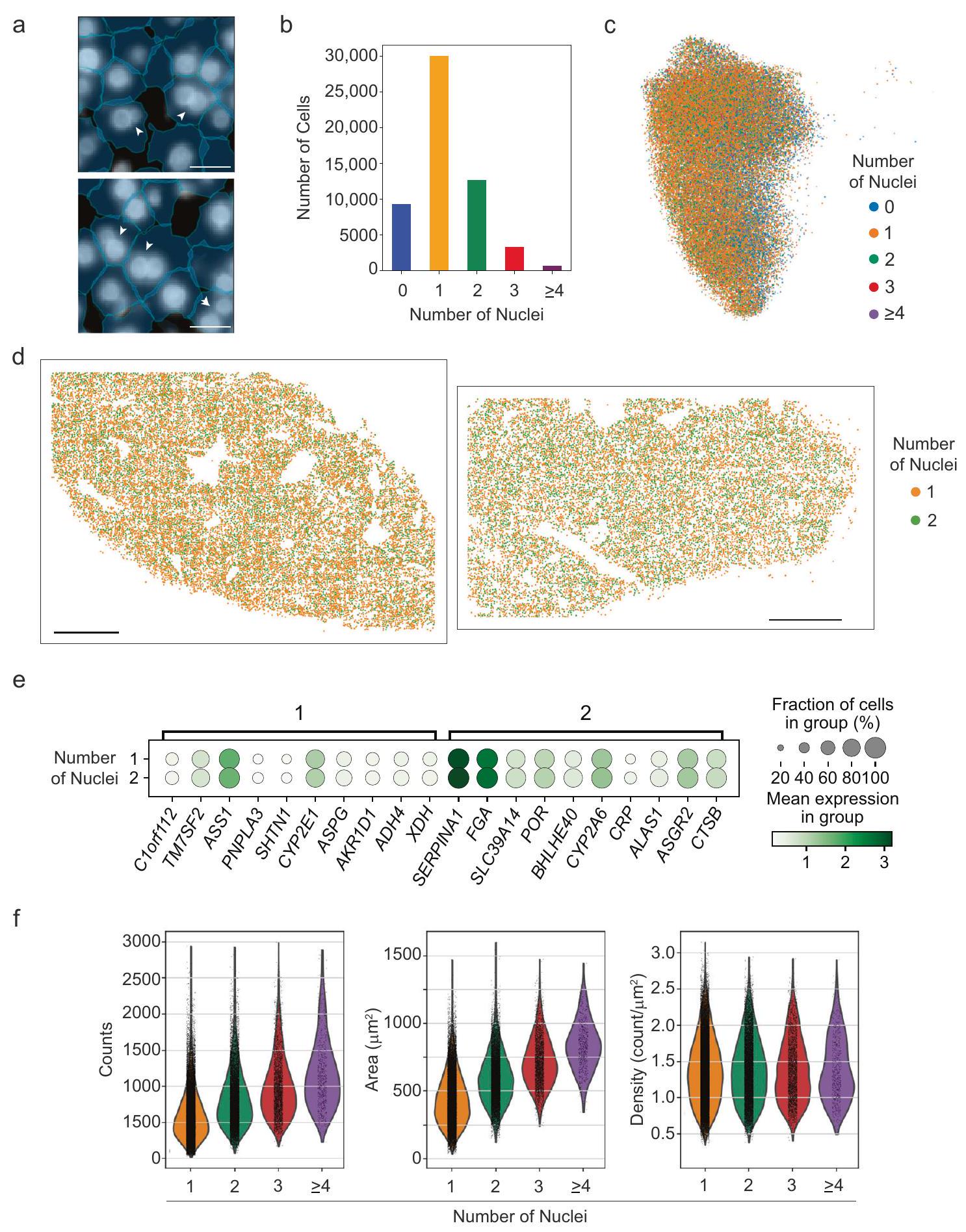 zones (Fig. 4c, d), and we did not observe any significant changes in expression of genes between hepatocytes with one or two nuclei as quantified by MERFISH (Fig. 4e). Nonetheless, the total RNA counts per cell increased with nuclei number (Fig. 4f, left) as did the cell area