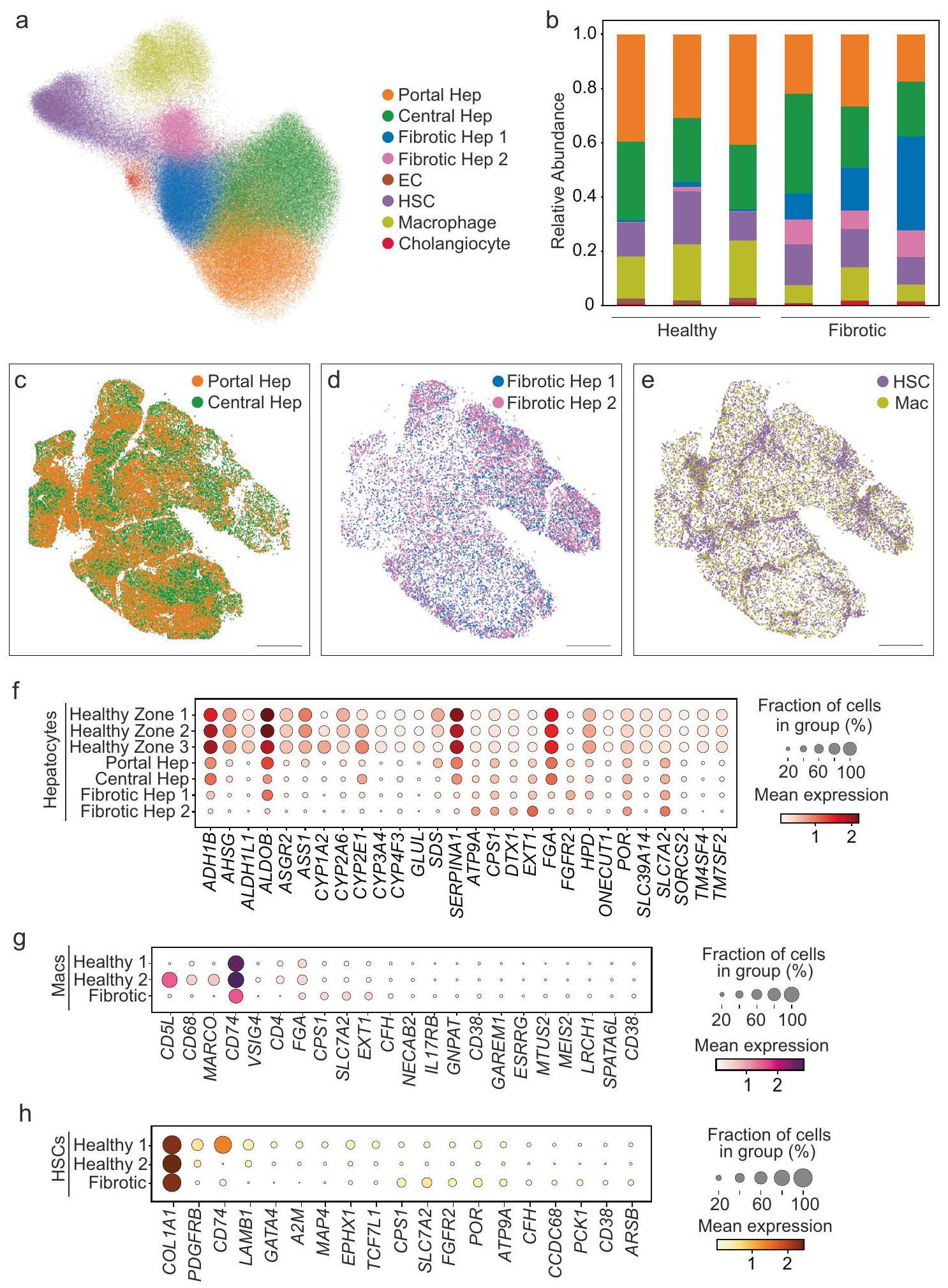 Data file. c-e Spatial distribution of cell populations in the fibrotic liver (donor 4), highlight hepatocytes that are similar to those seen in healthy samples (c), hepatocyte populations that are identified only when including fibrotic liver samples (d), and key non-parenchymal cells (e). Scale bar: . f-h Dot plot quantifying expression of genes differentially expressed in clusters seen in healthy measurements (Healthy zone 1, 2, or 3) or in fibrotic samples (Portal Hep, Central Hep, Fibrotic Hep 1, or Fibrotic Hep 2) for hepatocytes (f), macrophages (g), and HSCs (h). Macs Healthy 1 and Healthy 2 refer to Mac 1 and Mac 2 cells in healthy liver, and HSCs Healthy 1 and Healthy 2 refer to HSC 1 and HSC 2 cells in healthy liver.