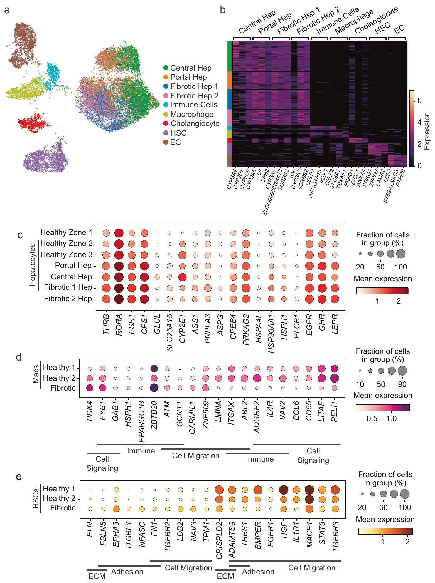genes characteristics of individual cell clusters are indicated on the top, and cells are grouped by cluster as indicated by color at the left. c Dot plot quantifying expression of genes differentially expressed in clusters seen in healthy measurements (Healthy zone 1, 2, or 3) or in fibrotic samples (Portal Hep, Central Hep, Fibrotic Hep 1, or Fibrotic Hep 2) for hepatocytes. Dot plots quantifying expression of genes differentially expressed in macrophages (d) and HSCs (e) are shown. Macs Healthy 1 and Healthy 2 refer to Mac 1 and Mac 2 cells in healthy liver, and HSCs Healthy 1 and Healthy 2 refer to HSC 1 and HSC 2 cells in healthy liver.