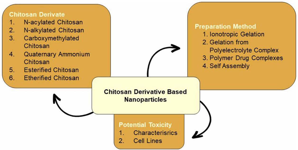 الكيتوزان هو بوليمر وظيفي في مجال الأدوية، بما في ذلك أنظمة توصيل الأدوية باستخدام الجسيمات النانوية. تعتبر الجسيمات النانوية المعتمدة على الكيتوزان حاملة واعدة لمجموعة واسعة من العوامل العلاجية ويمكن إدارتها بطرق مختلفة. الذوبانية هي المشكلة الرئيسية في إنتاجه واستخدامه في الصناعات الكبيرة. تم استخدام تعديلات الكيتوزان لتعزيز ذوبانيته، بما في ذلك التعديل الكيميائي. وقد أبلغت العديد من المراجعات عن التعديل الكيميائي ولكن لم تركز على الخصائص المحددة التي تم الحصول عليها. ركزت هذه المراجعة على التعديل لتحسين ذوبانية الكيتوزان. بالإضافة إلى ذلك، ركزت هذه المراجعة أيضًا على تطبيق مشتقات الكيتوزان في أنظمة توصيل الأدوية باستخدام الجسيمات النانوية حيث تم الإبلاغ عن عدد قليل جدًا من المراجعات المماثلة. كما تم الإبلاغ عن الطريقة المحددة للجسيمات النانوية المعتمدة على مشتقات الكيتوزان، وتم وصف أحدث التقارير عن الكيتوزان ومشتقات الكيتوزان وسميته.