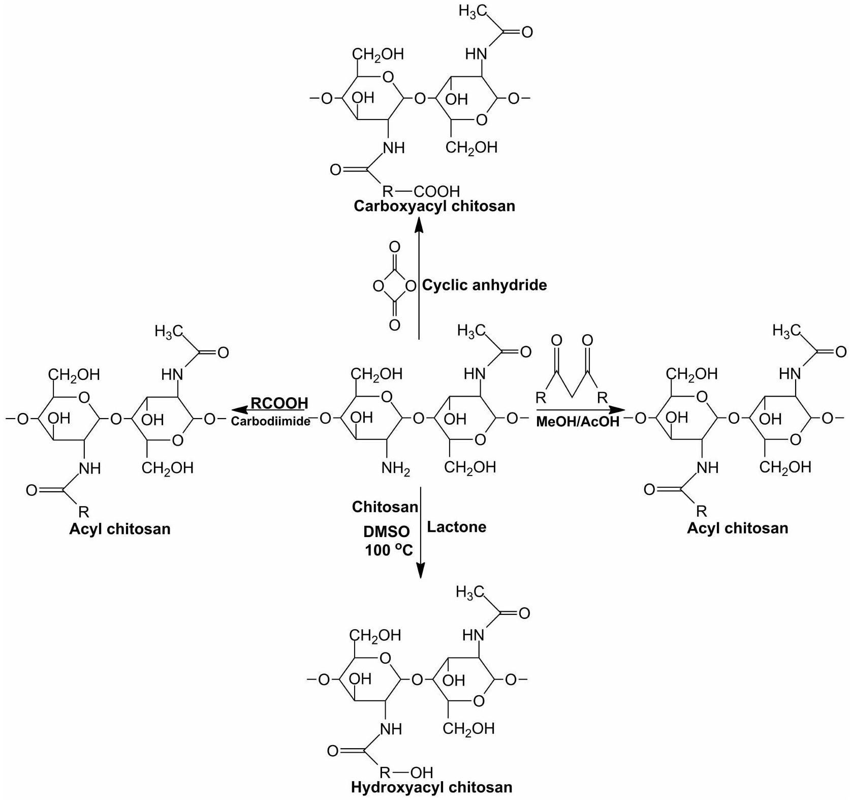 تدمير تفاعل الهيدروجين في الكيتوزان من خلال الأسيلاسيون يحسن من قابلية ذوبان الكيتوزان.مجموعة الأمين في الكيتوزان أكثر تفاعلاً من المجموعة الهيدروكسيلية الأولية؛ لذلك، فإن تفاعل الأسيل هو في الغالب في مجموعة الأمين.يتم إجراء أسيلينغ الكيتوزان عن طريق إدخال مجموعة أسيل عطرية أو أليفاتية.تفاعل التخليق لـ N-acylated chitosan موضح في الشكل 2.
