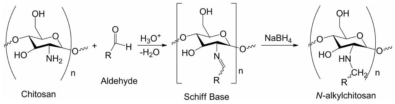 تم إجراء قاعدة شيف من خلال تفاعل قاعدة شيف مع الألدهيد وتقليل، مما يؤدي إلى الكيتوزان N-ألكيلي. تفاعل قاعدة شيف مع يوديد الميثيل يؤدي إلى كواترنات الكيتوزان مما يحسن من قابلية الذوبان في الماء.تم أيضًا تخليق الكيتوزان المكلور باستخدام تفاعل إضافة مايكل بين أكريلات الهيدروكسي إيثيل والكيتوزان لتحسين قابلية ذوبان الكيتوزان في الماء.إن إدخال ثنائي السكريات إلى الكيتوزان ينتج كيتوزان N-ألكيلي قابل للذوبان في الماء.وجد بالاسيو وآخرون أن الكيتوزان الميثيلي N-alkylated يحسن من قابلية الذوبان في الماء بسبب الشحنة الإيجابية الناتجة عن مجموعة الأمونيوم الرباعية، وأن المشتقات قابلة للذوبان في نطاق واسع من الرقم الهيدروجيني من 3 إلى 14، في حين أن الكيتوزان غير المشتق قابل للذوبان فقط في الأحماض.تمت دراسة الكيتوزان المؤلكل بواسطة تشين وآخرين الذين ذكروا أن الكيتوزان المؤلكل تم تصميمه باستخدام