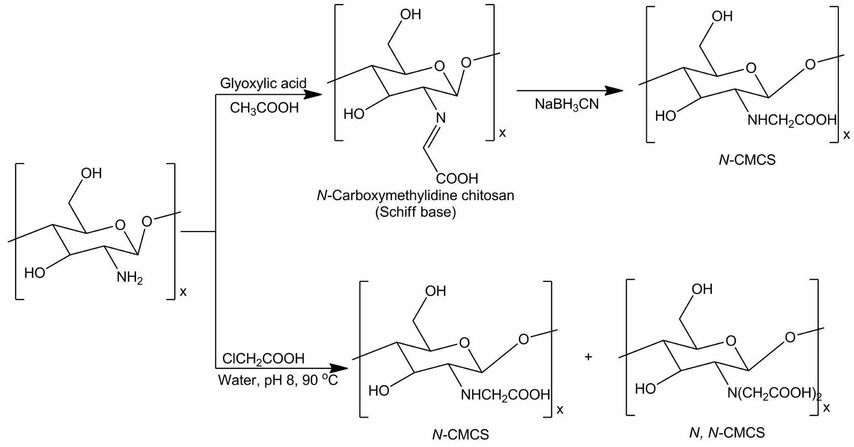 الكيتوزان المكلور هو قابل للذوبان في الماء في درجة الحموضة المحايدة والقلوية. يتم الحصول على الكيتوزان المكلور عن طريق إدخال حمض الكربوكسيليك (حمض الجلايوكسيليك أو حمض الكلورو ألكانوك).مجموعة أومجموعة من الكيتوزان.الكربوكسيميثيليشن هو التفاعل الأكثر شيوعًا للحصول على الكيتوزان المكلور. تعتمد قابلية ذوبان الكيتوزان المكلور في الماء على درجة الكربوكسيميثيليشن للكيتوزان.أنواع الكيتوزان الكاربوكسي ميثيل (CMCS) التي تم الحصول عليها يمكن أن تكون N-CMCS، O-CMCS، N، O-CMCS و N، N-CMCS.تفاعل الكاربوكسي ميثيليشن موضح في الشكل 4. تم تحضير N-كاربوكسي ميثيل كيتوزان باستخدام حمض الجلايوكسيليك وصوديوم سيانوبوروهيدرايد.أعد سونغ وآخرون أيضًا N-كربوكسي ميثيل كيتوزان باستخدام حمض الكلورو أسيتيك في الماء (بـ pH محايد)، وتم استخدامه للتحكم في نظام التفاعل عند درجة حموضة محايدة منتم وصف الكيتوزان O-كربوكسي ميثيل بواسطة محمد وآخرون باستخدام حمض المونوكلوروأسيتيك.إعدادتم الإبلاغ عن الكيتوزان -كربوكسي ميثيل بواسطة باتالي وآخرون.تم تحضير -كربوكسي ميثيل كيتوزان عن طريق إضافة الكحول الإيزوبروبيلي إلى الكيتوزان. ثم أضيفت محلول هيدروكسيد الصوديوم إلى المعلق الناتج وتم التحريك لمدة 45 دقيقة. بعد ذلك، أضيفت حمض أحادي الكلور الأسيتي الصلب إلى المعلق القلوي وتم التحريك لمدة 20 دقيقة.تم الإبلاغ عن تحضير قواعد شيف المستندة إلى الهيدرازيد O-CMCS القابلة للذوبان في الماء من خلال تفاعل في الموقع بواسطة مانموهان وآخرين.تفاعل الكاربوكسي ميثيليشن موضح في الشكل 4.