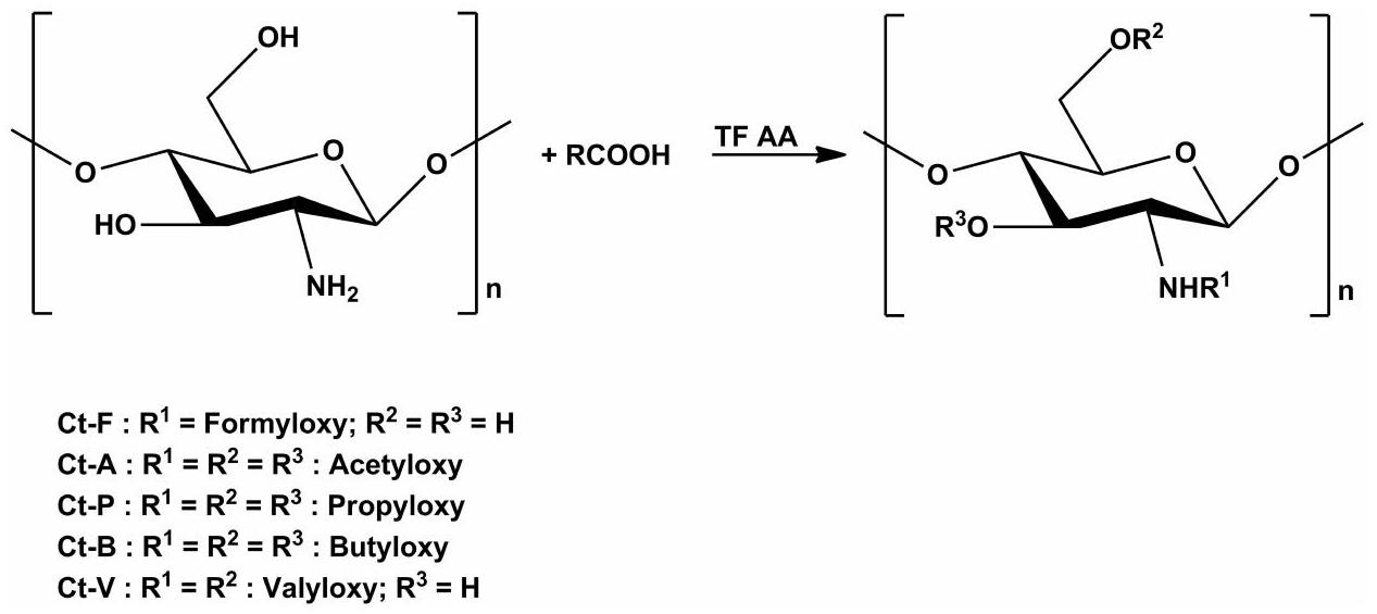 تشمل استرة الكيتوزان تفاعل الكيتوزان مع الأحماض الكربوكسيلية أو مشتقاتها.وثق وان وآخرون تخليق استر الكيتوزان القابل للذوبان في الماء (استر الكيتوزان p-أمينوبنزويلي) باستخدام طريقة قاعدة شيف.طريقة أخرى تم الإبلاغ عنها تضمنت إنشاء كيتوزان مكلور بواسطة معالجة الكيتوزان بمزيج من DMF وحمض ثنائي كلورو الأسيتيك وحمض الكلوروسولفونيك.تم الحصول على أسيتات الكيتوزان عن طريق تغيير نسبة حمض الأسيتيك إلى الكيتوزان، بينما تم تحضير جلوتامات الكيتوزان عن طريق إذابة الكيتوزان في حمض الجلوتاميك.في براءة اختراع من يون وآخرين، تم تفصيل عملية استرification للكيتوزان باستخدام أحماض كربوكسيلية متنوعة (حمض الأسيتيك، حمض الفورميك، حمض البروبيونيك، حمض البوتيريك، وحمض الفاليريك) بالإضافة إلى أنهدريد ثلاثي فلور الأسيتيك (TFAA).تم توضيح التمثيل التخطيطي لتفاعل الإسترification للكيتوزان في الشكل 6.