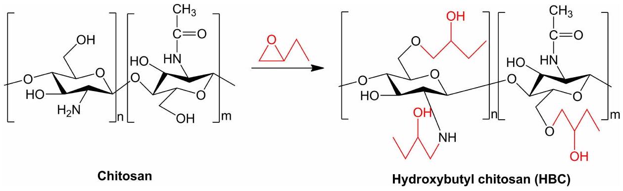 A chitosan-etherified derivative is obtained by reacting the alkylating agent with chitosan. A chitosan-etherified derivative is water soluble and has good water retention, is nontoxic, bacteriostatic, and has wider applications in the pharmaceutical field. The methyl chitosan was prepared by reacting dimethyl sulfate and chitosan in an aqueous alkali/urea solution. , O-carboxymethyl chitosan was derivatized from chitosan by adding NaOH and monochloroacetic acid. The etherification process was conducted in temperatures of Cationic chitosan derivatives with long-chain alkyl (HDCC) were synthesized by using 2 kinds of etherifying agents, which are (2,3-epoxypropoxy) dodecyl dimethyl ammonium chloride and glycidyl trimethylammonium chloride. Yang et al found that the commonly used etherifying agents to produce etherified chitosan are 3-chloro-2-hydroxypropyl trimethylammonium chloride (CTA), 2.3,-epoxypropyl trimethyl ammonium chloride (ETA), and carboxyethyl groups. Hydroxy butyl chitosan (HBC) is