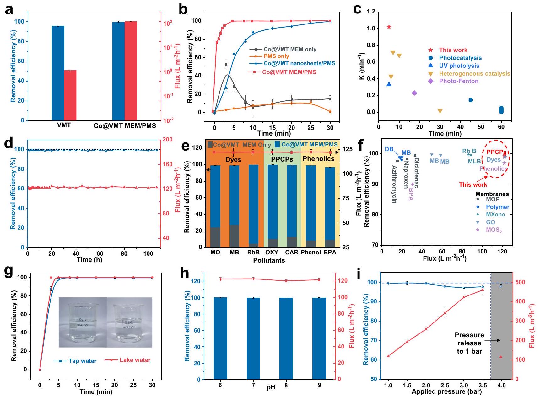 In addition, the water flux increased almost linearly with the operating pressure and still maintained a relatively stable and high removal efficiency (Fig. 2i). This result suggested that the membrane structure did not collapse under continuously increasing pressure while avoiding holes and defects. On the other hand, increasing the membrane water flux shortened the retention time of pollutants in the membrane, potentially diminishing the removal efficiency of pollutants. The removal efficiency of ranitidine remained stable at when the water flux increased from 122.4 to (Fig. 2i). However, the further increase of water flux resulted in the decrease of removal efficiency. When the water flux increased to , the removal efficiency of ranitidine decreased to (Fig. 2i). As such, the membrane water flux should be less than in order to achieve a removal efficiency of ranitidine. When the pressure recovered down to 1 bar, the membrane exhibited almost the same flux and removal efficiency as before, thus indicating the regular layer structure and excellent mechanical properties of Co@VMT MEM .