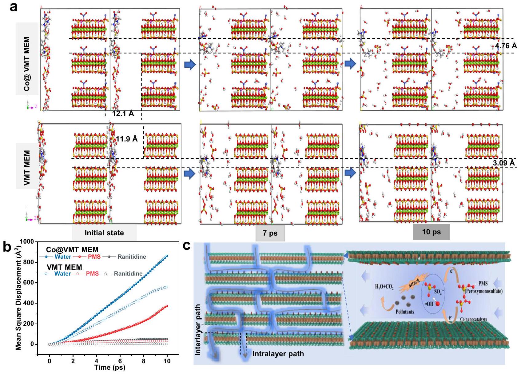 simulations to elucidate the diffusion of ranitidine, water, and PMS within the Co@VMT membrane nanochannels . Ranitidine, water, and PMS can follow both the intralayer and interlayer diffusion paths within the membrane nanochannels. As shown in Fig. 3a and Supplementary Movie 1, the narrow interlayer free spacing ( ) of VMT MEM could barely allow the mass transfer of water, ranitidine ( ), and PMS ( ) (Supplementary Fig. 12) within interlayer paths, which resulted in the increased mass transfer resistance and a low flux (Fig. 2a) with intralayers as the main mass transfer paths . However, the enlarged interlayer free spacing ( ) of the Co@VMT MEM not only enabled the transport of water and PMS molecules through the interlayer paths, but also boosted the mass transfer through the downward intralayer paths with a free spacing of 1.21 nm working as the predominant mass transport channel for large ranitidine molecules (Supplementary Movie 2). Therefore, a high flux was achieved, two orders of magnitude higher than that of the VMT MEM (Fig. 2a). The Mean Square Displacement (MSD) curves (Fig. 3b) displayed a significant increase in the mass transfer rate through Co@VMT MEM compared with VMT MEM, especially for water and PMS molecules. Water exhibited the fastest mass transfer in nanochannels, which may be attributed to high capillary pressures and the highly ordered structure of water in nano-spaces . The above MD results indicate that PMS could swiftly interact with the Co catalytic sites in both the interlayer and intralayer paths of Co@VMT MEM (Fig. 3a), contributing to the efficiently catalytic decomposition of PMS molecules into ROS as well as collisions and reactions between ROS and pollutants (Fig. 3c).