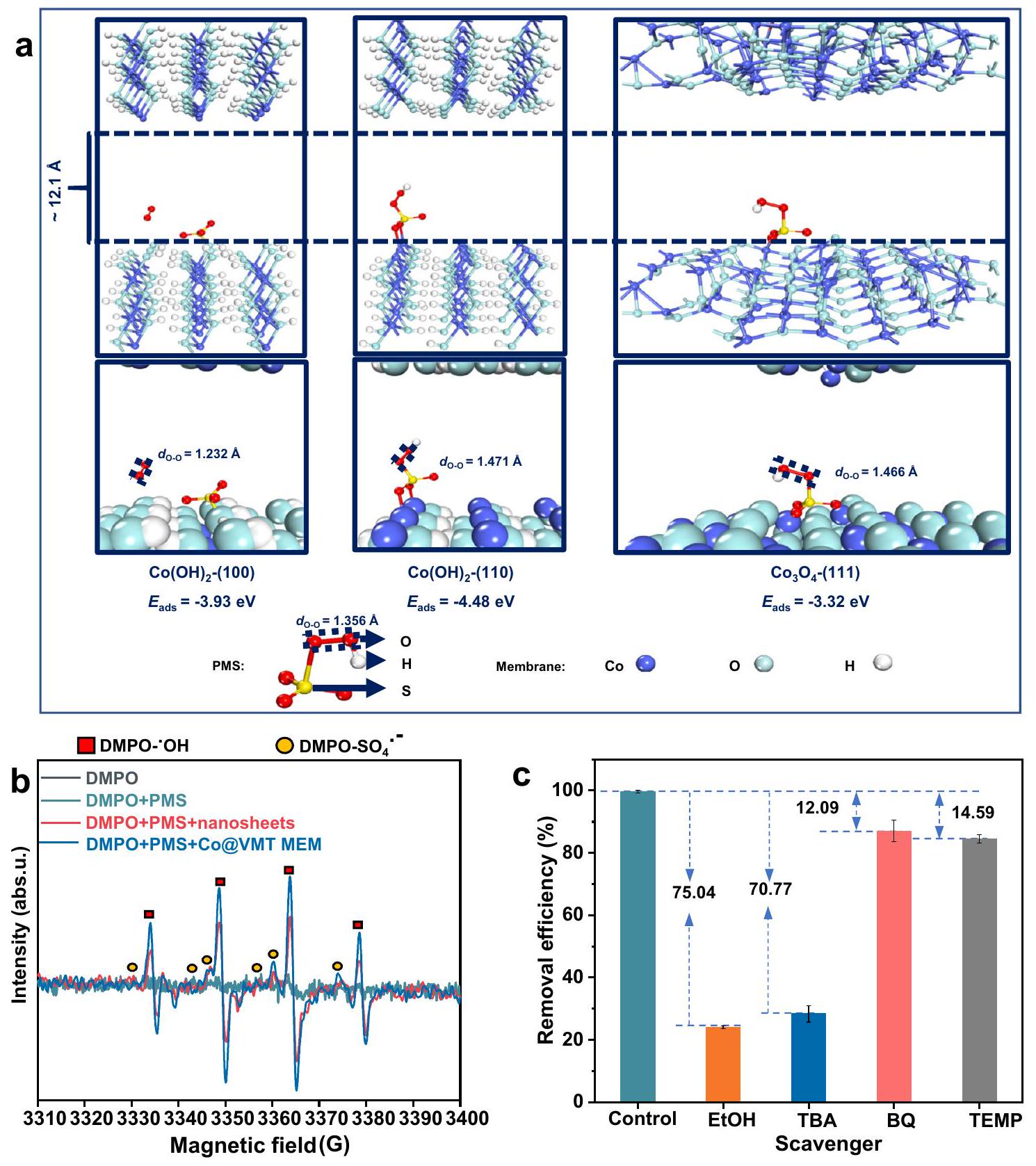 تم إجراء حسابات DFT لتقييم أداء تنشيط PMS بواسطة و المراحل داخل Co@VMT MEM. تم إجراء جميع الحسابات المتعلقة بتأثير النانو احتجاز Co@VMT MEM على تنشيط PMS تحت المسافة الحرة داخل الطبقة البالغة 1.21 نانومتر، والتي كانت القناة الرئيسية لنقل الكتلة لجزيئات الرانيتيدين الكبيرة وكانت الموقع الرئيسي لتفاعلات AOP وفقًا لمحاكاة الديناميكا الجزيئية (الشكل 3 أ والفيلم التكميلي 2). طاقة الامتزاز (قيم جزيئات PMS على المستويات (100) و(110) منو (111) مستوى منكانواو -3.32 إلكترون فولت، على التوالي، مما يعني عمليات تنشيط تلقائية لـ PMS بواسطة و (الشكل 4أ). بعد الامتزاز، الـطول الرابطة ( ) في جزيء PMS الممتص امتد من 1.356 (PMS وحده) إلى 1.466 (PMS الممتص على السطح (111) من ) و (PMS ممتص على السطح (110) من )، مما يشير إلى التفكك التلقائي لـ PMS وتحوله إلى ROS من أجل تحلل الملوثات العضوية .