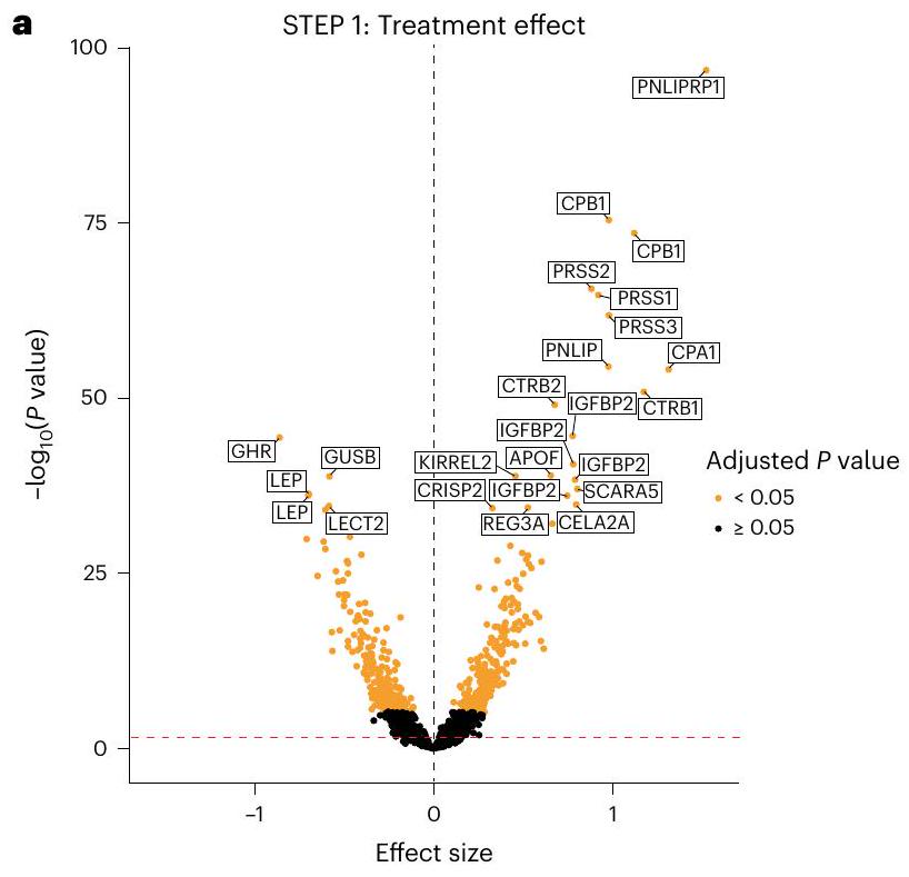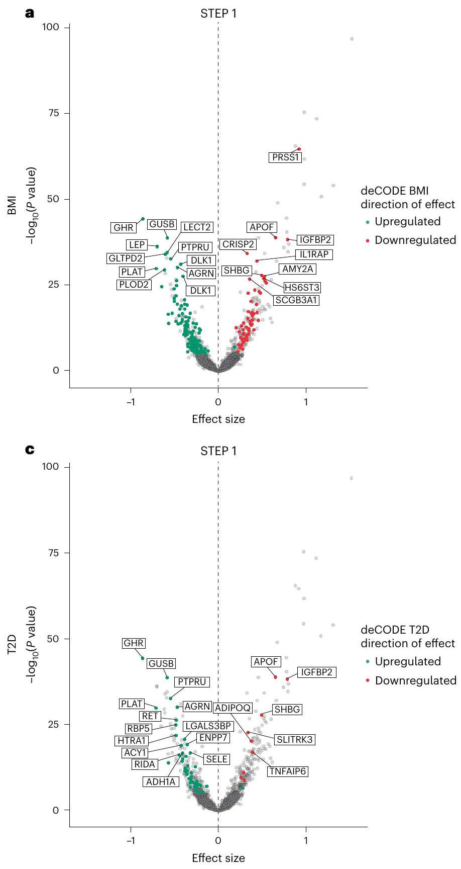 والبروتينات التي تم تنظيمها بشكل كبير في هذا التحليل مرتبطة بتأثيرات بيولوجية متنوعة (على سبيل المثال، الإجهاد القلبي، الالتهاب وعمليات الأيض الدهني) وقد وُجد سابقًا أنها مرتفعة في أمراض القلب والأوعية الدموية أو مرتبطة بزيادة خطر الإصابة بها. البروتينات التي تم تنظيمها بشكل كبير عند التعديل لتأثيرات وزن الجسم في الخطوة 1 والمعروفة بأنها مرتبطة بخطر الإصابة بأمراض القلب والأوعية الدموية تضمنت تيناسين C (TNC)، NT-proBNP، ثرومبوسبوندين 2 (THBS2)، مستقبل مكون المكمل C1q (مجموعة التمايز 93 (CD93))، مستقبل الماكروفاج 1-النطاق الخارجي (MSR1) وأنجيوبيوتين-2 (ANGPT2). بينما تضمنت البروتينات الأخرى التي تم تنظيمها بشكل كبير وغير المرتبطة بأمراض القلب والأوعية الدموية البروتين السري المتعلق بفريزل-4 (sFRP4) وبروتين ربط الأحماض الدهنية في الكبد (LFABP)، في حين تم تنظيم الجرونولين (GRN) بشكل كبير. مشابهًا للتحليل السابق الذي تم فيه أخذ وزن الجسم في الاعتبار و