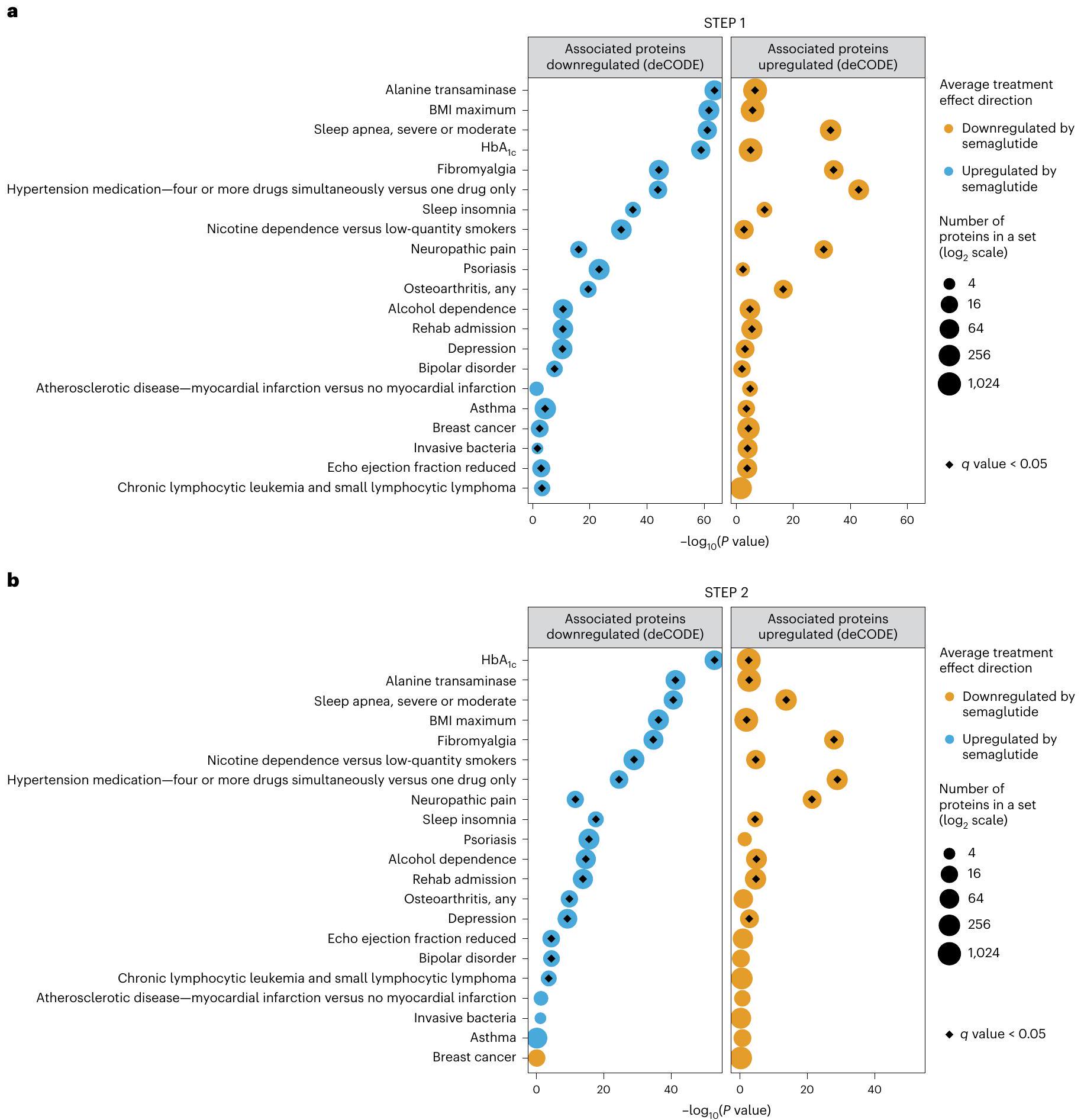 (الشكل 4). على سبيل المثال، في STEP1، خفض السيماغلوتيد البروتينات التي يتم تنظيمها بشكل زائد في الفيبروميالجيا، ارتفاع ضغط الدم، اضطرابات تعاطي المواد، الألم العصبي، التهاب المفاصل، الصدفية، الاكتئاب، الربو، سرطان الثدي وانخفاض الكسر القذفي، وزاد البروتينات التي يتم تنظيمها بشكل ناقص في هذه الحالات (بالإضافة إلى اللوكيميا اللمفاوية المزمنة واللمفوما اللمفاوية الصغيرة على الرغم من