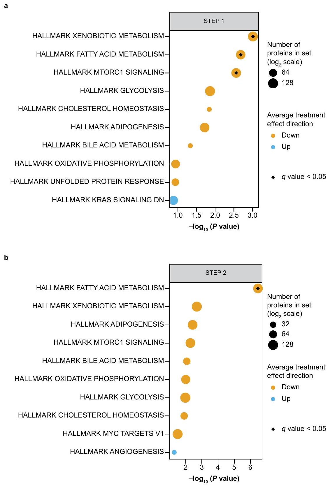 in STEP 1 and STEP 2 are shown in Extended Data Fig. 1. No effect of sex was detected in the proteomic response to semaglutide treatment in either STEP 1 or STEP 2 (Supplementary Tables 4 and 5).