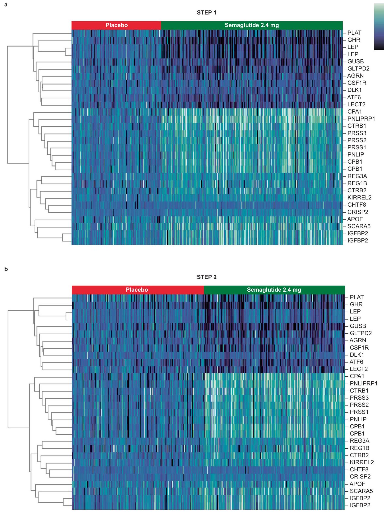 تم عرض STEP 1 و STEP 2 في الشكل البياني الموسع 1. لم يتم الكشف عن أي تأثير للجنس في الاستجابة البروتينية لعلاج السيماغلوتيد في كل من STEP 1 و STEP 2 (الجداول التكميلية 4 و 5).