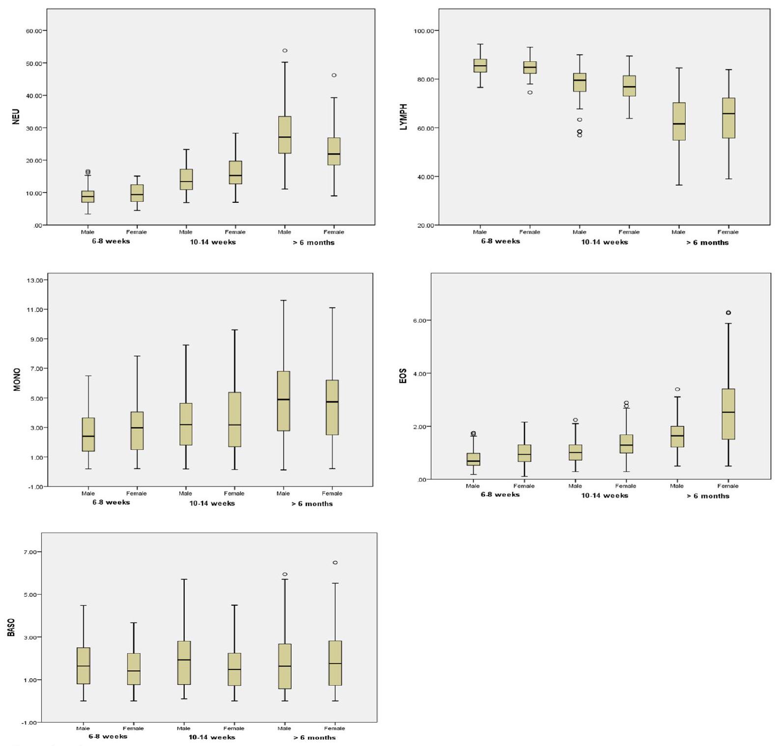 It is reported that aging causes an increase in bleeding time and a decrease in PLT count [26]. Similar finding was observed in our experiments showing a decrease in PLT count with increasing age. We also observed a higher PLT count in females than males, a similar finding reported in humans [27,28]. Males showed a significantly higher WBC than females. WBC progressively decreases in females with age, which is not observed in males. NEU%, MONO% and EOS% values increased with age, whereas LYMPH% decreased with age in both sexes. The findings were in agreement with studies in Wistar rats [11, 12, 23].