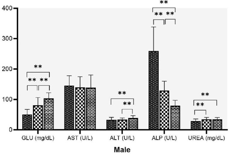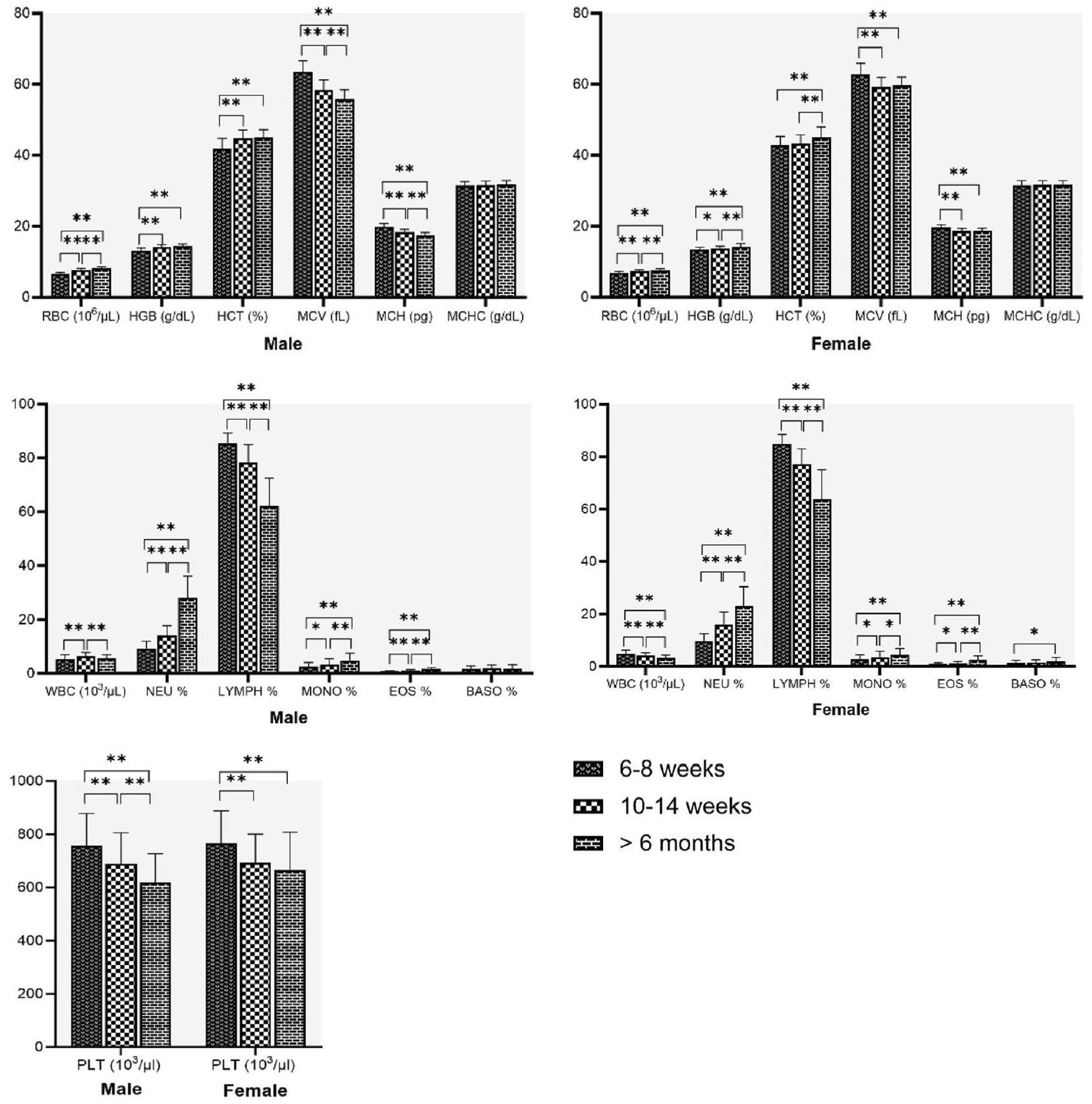 كان لدى الفئران الذكور عدد كريات الدم البيضاء و MCH أعلى بشكل ملحوظ مقارنة بالفئران الإناث. كان لدى الفئران الإناث عدد كريات الدم الحمراء، والهيموجلوبين، والهيماتوكريت، ونسبة الإيوزينوفيل أعلى بشكل ملحوظ مقارنة بالفئران الذكور (الشكل 1). لم يتم العثور على فروق ذات دلالة إحصائية بين الفئران الذكور والإناث في قيم MCV و MCHC و PLT و NEU% و LYMPH% و MONO% و BASO%. تم تلخيص بيانات الفئران ويستار التي تتراوح أعمارها بين 10-14 أسبوعًا في الجدول 3 كمتوسط، والانحراف المعياري، والوسيط، ونطاق المرجع. كان لدى الفئران الذكور عدد كريات الدم البيضاء أعلى بشكل ملحوظ،