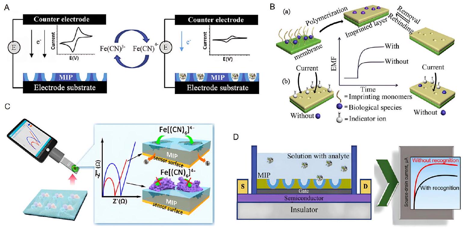 Fig. 2. Working principles for MIP-based (A) voltammetric sensor, (B) potentiometric sensor (Wang et al., 2020), (C) impedimetric sensor (Raziq et al., 2021, Wang et al., 2022b), and (D) FET sensor.