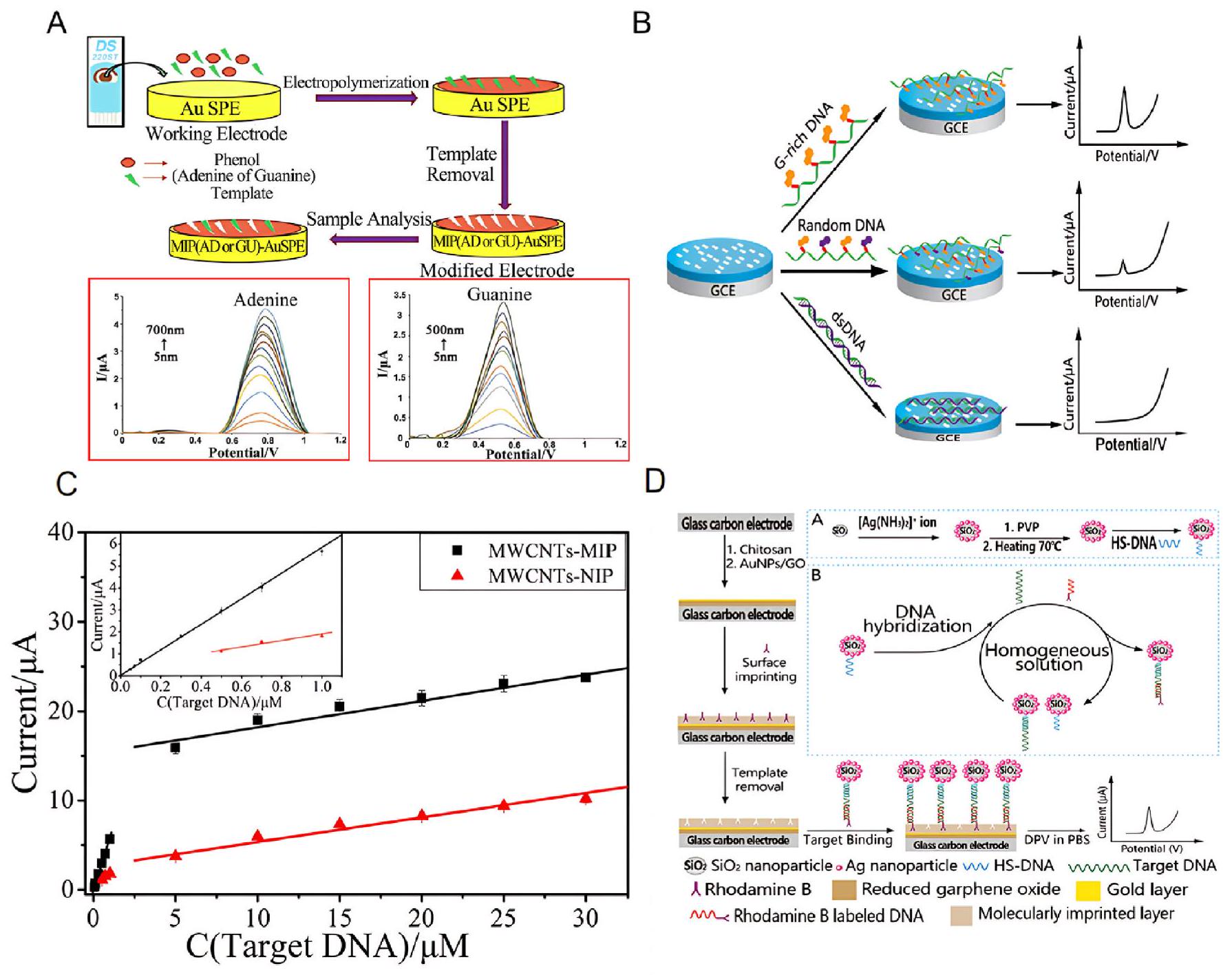selectivity when interfered by both mismatched oligonucleotides and Dulbecco’s modified Eagle’s medium sample. You used MWCNTs as the supporting material with a novel surface poly (methacrylic acid) (PMAA)-MIP strategy to design a label-free multi-site electrochemical sensor for the detection of GU rich-DNA, as reported in Fig. 3(B) (You et al., 2016). In this study, PMAA-MIP composites were prepared by a selective copolymerization of methacrylic acid, ethylene glycol dimethacrylate, and GU on the surface of vinyl-functionalized MWCNTs. This design allowed the direct monitoring of GU oxidation current, where the complex modification of redox mediators and the ineffective pre-fixation process of probe DNA were avoided. As shown in Fig. 3(C), this sensor exhibited a high selectivity for GU-rich DNA, with a linear dynamic range of and , and the LoD of 7.52 nM . It is worth noting that this sensor exhibited excellent performance in both human serum and urine samples, which makes it promising for clinical applications. However, this method requires the combination of nitrogenous bases exposed by ssDNA with the cavities in MIP, which hinders its clinical application, as most DNA sequences are double-stranded in human body fluids.