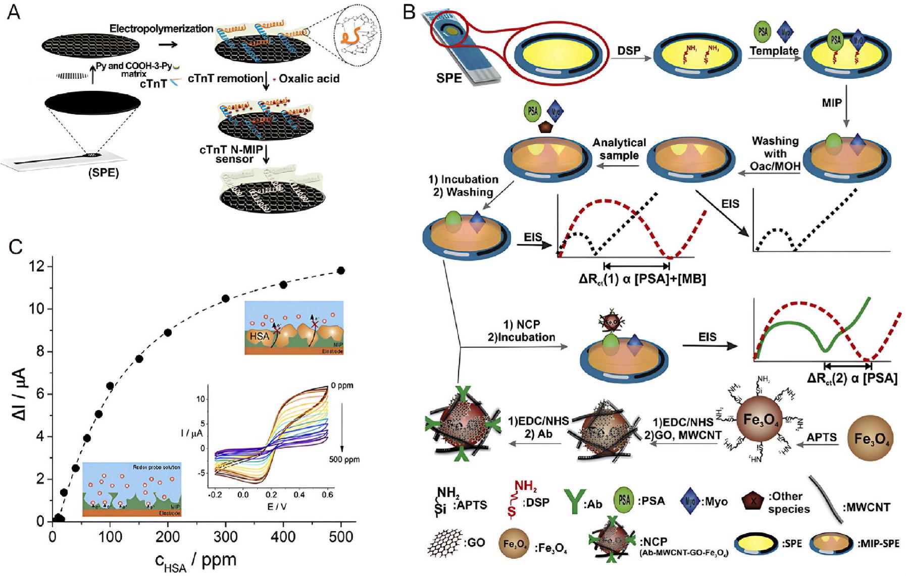 Fig. 4. MIP-based electrochemical sensors for protein biomarkers detection. (A) Fabrication of N-MIP sensor for cTnT detection (Silva et al., 2016). (B) Assembly of dual-modal immunosensor based on MIP and nanostructured layer for the simultaneous detection of PSA and Myo (Karami et al., 2019). (C) Concentration dependence of sensor response for HSA detection (Stojanovic et al., 2017).