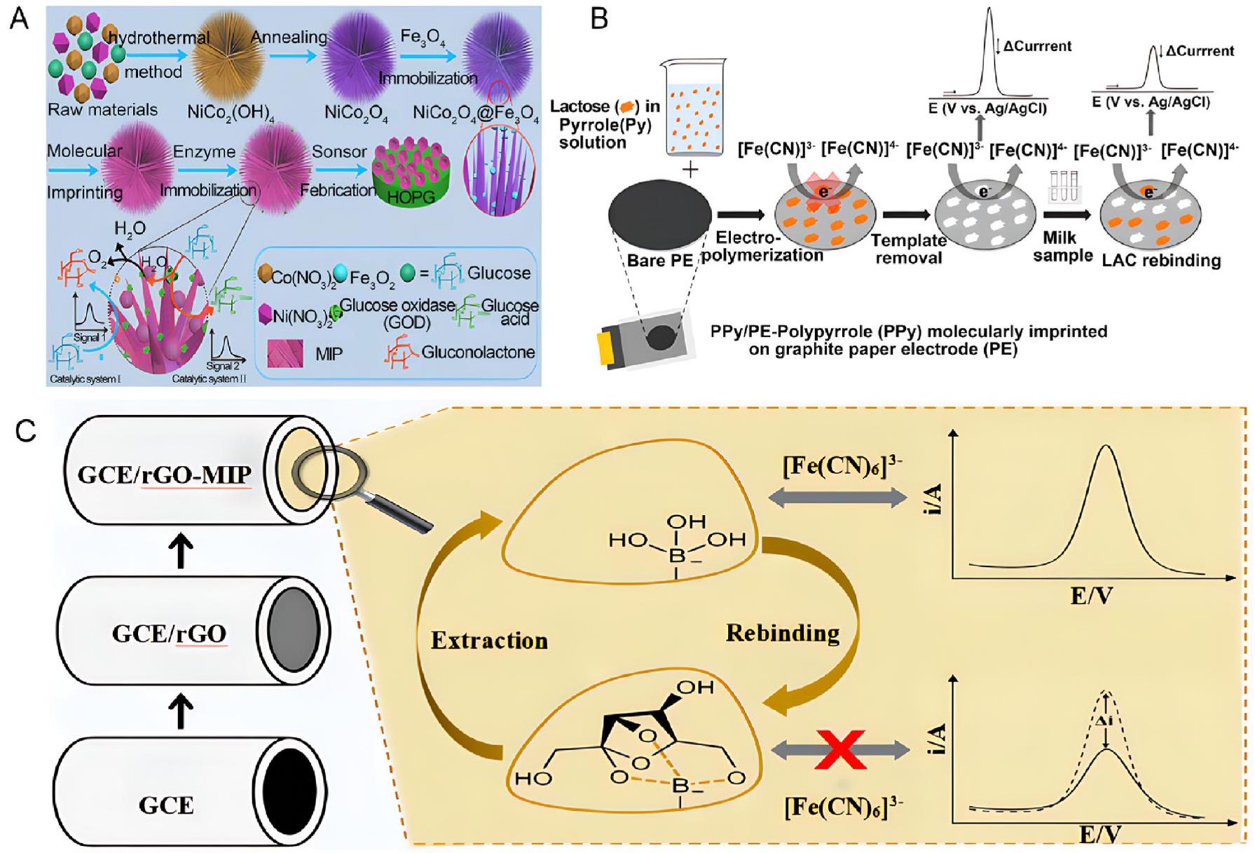 Fig. 5. MIP-based electrochemical sensors for saccharides detection. (A) Stepwise preparation of -MIPs for glucose detection (Chen, Wei et al., 2020). (B) Fabrication of PPy/PE for lactose detection (da Silva et al., 2021). (C) Mechanism of GCE/rGO-MIP sensor for fructose detection (Moreira et al., 2021).
