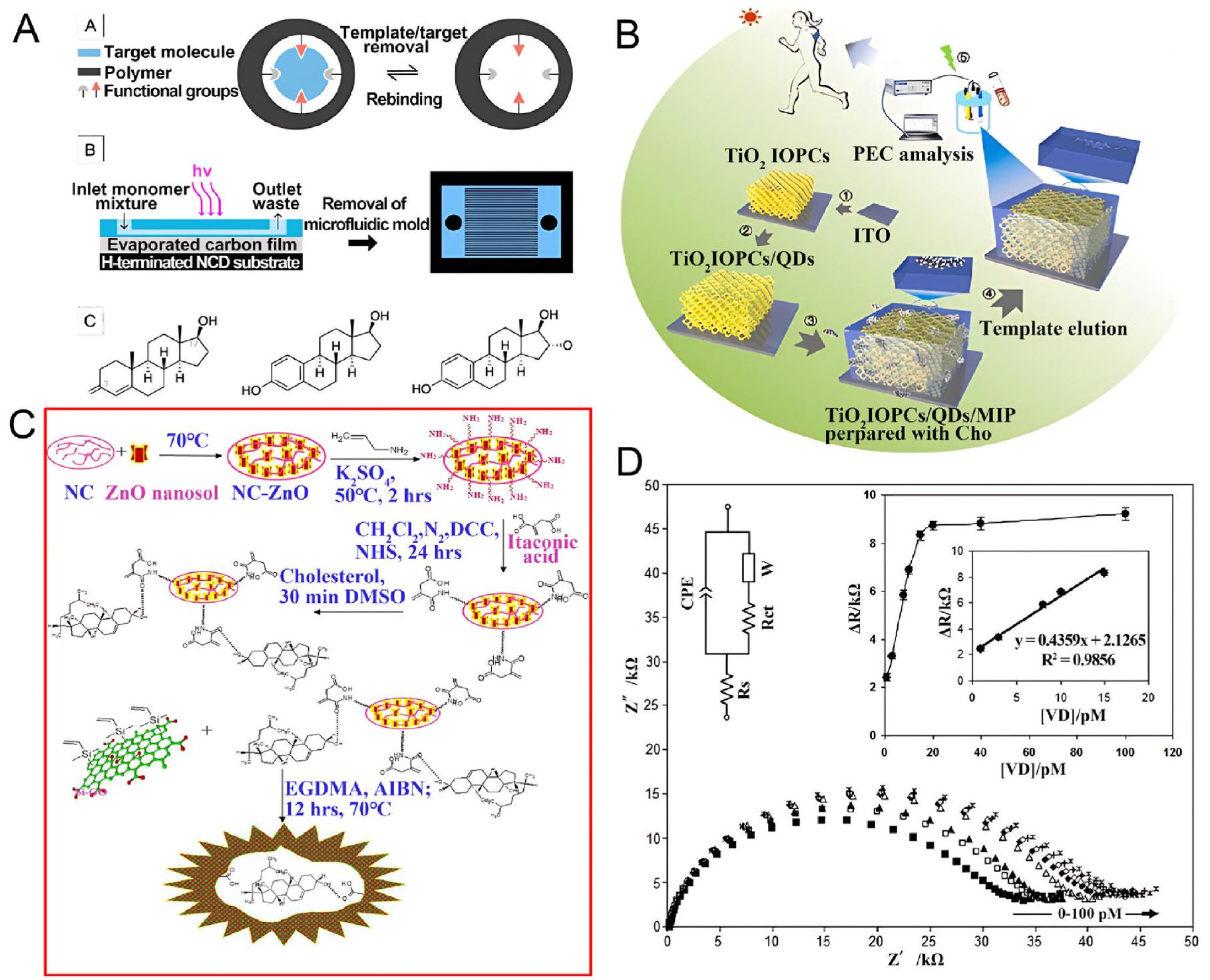 Fat-soluble vitamins can be absorbed into the body with lipids and stored in tissues to play important roles (Stevens, 2021). For example, Vitamin D (VD) acts as a hormone precursor regulating the intestinal absorption of calcium and magnesium and immunomodulation. A novel VD MIP sensor was designed (Alizadeh and Akhoundian, 2022), with acryloyl chloride reacting with VD to generate derivative monomers, which then copolymerize with divinylbenzene in the presence of VD to form an MIP layer. The sensing mechanism is based on the gating principle, which refers to the expansion of MIP particles. When the VD molecules intercalate into the selective cavities of the MIP nanoparticles, the electroactive probe species will be prevented from contacting the electrode surface to generate an impedance response, as shown in Fig. 6 (D), which has been validated in plasma samples.
