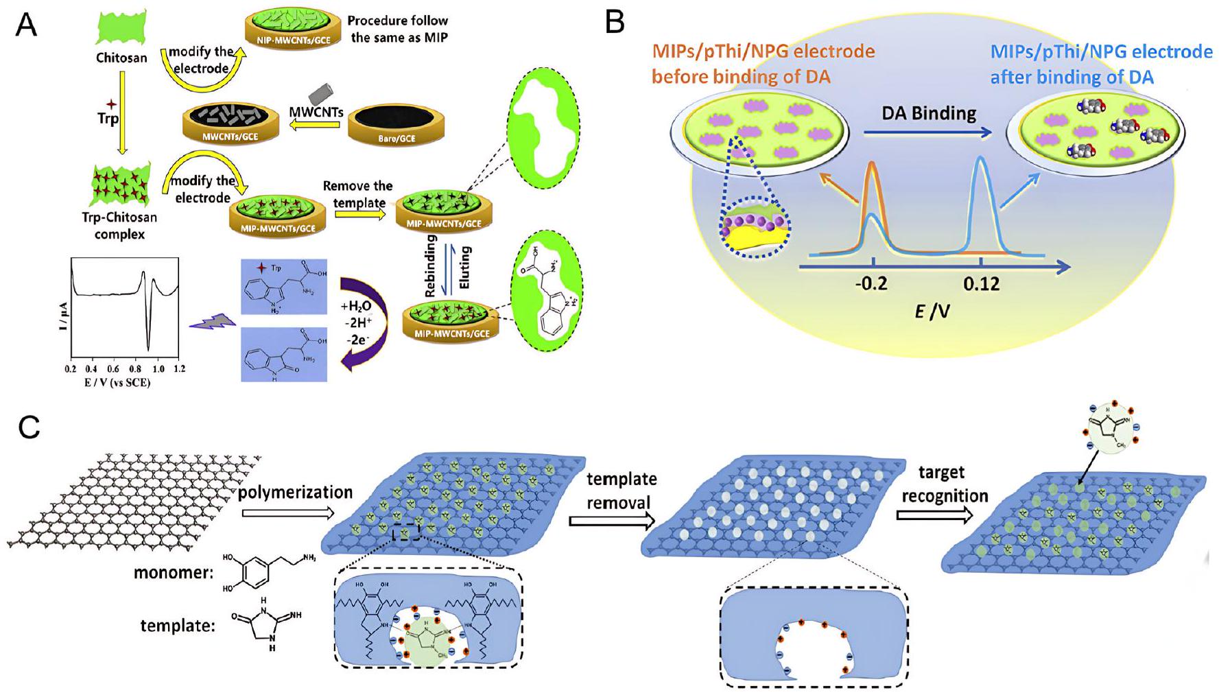 Fig. 7. MIP-based electrochemical sensors for small molecules detection. (A) Fabrication of MIP-MWCNTs/GCE for Trp detection (Wu et al., 2020). (B) Principle of NPG/Au DA sensor (Yang et al., 2019). (C) Fabrication of GNP/PDA-MIP creatinine sensor (Li et al., 2022).