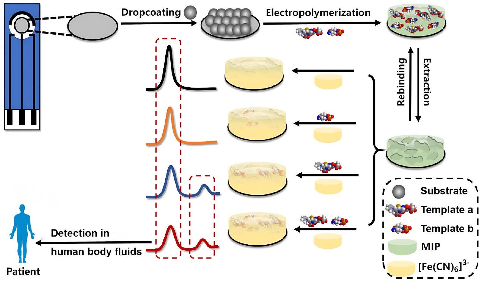 biomarkers to realize multiple analyte detection on a single MIP material is also ideal for multiplexed detection. The diagnostic accuracy and detection efficiency of the sensor can thus be greatly enhanced.