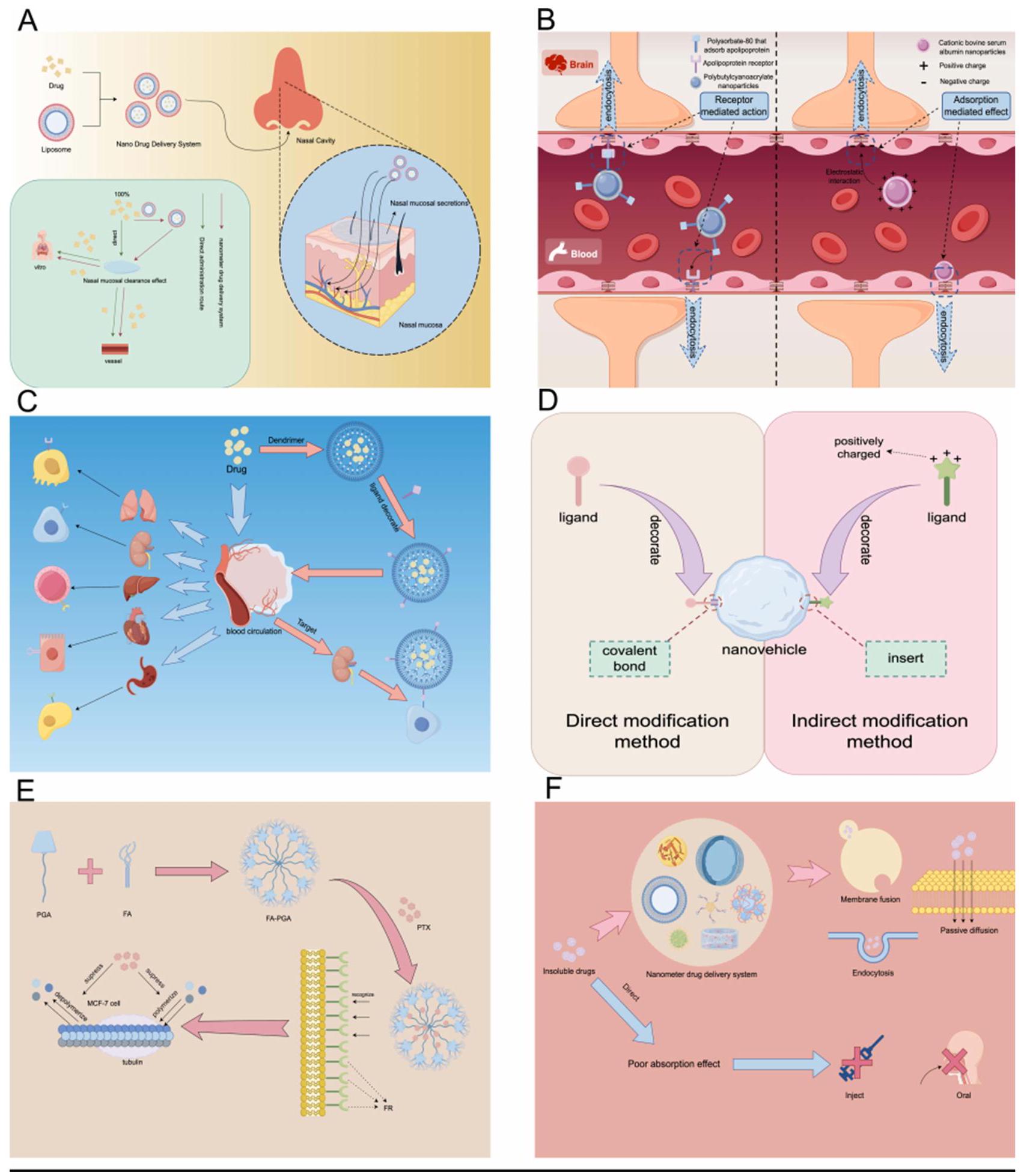 increasing cellular uptake and, consequently, drug efficacy, as illustrated in Figure 3C. There are primarily two methods for active targeting modifications: one involves the direct modification by covalently bonding ligands to drug carriers with active functional groups;