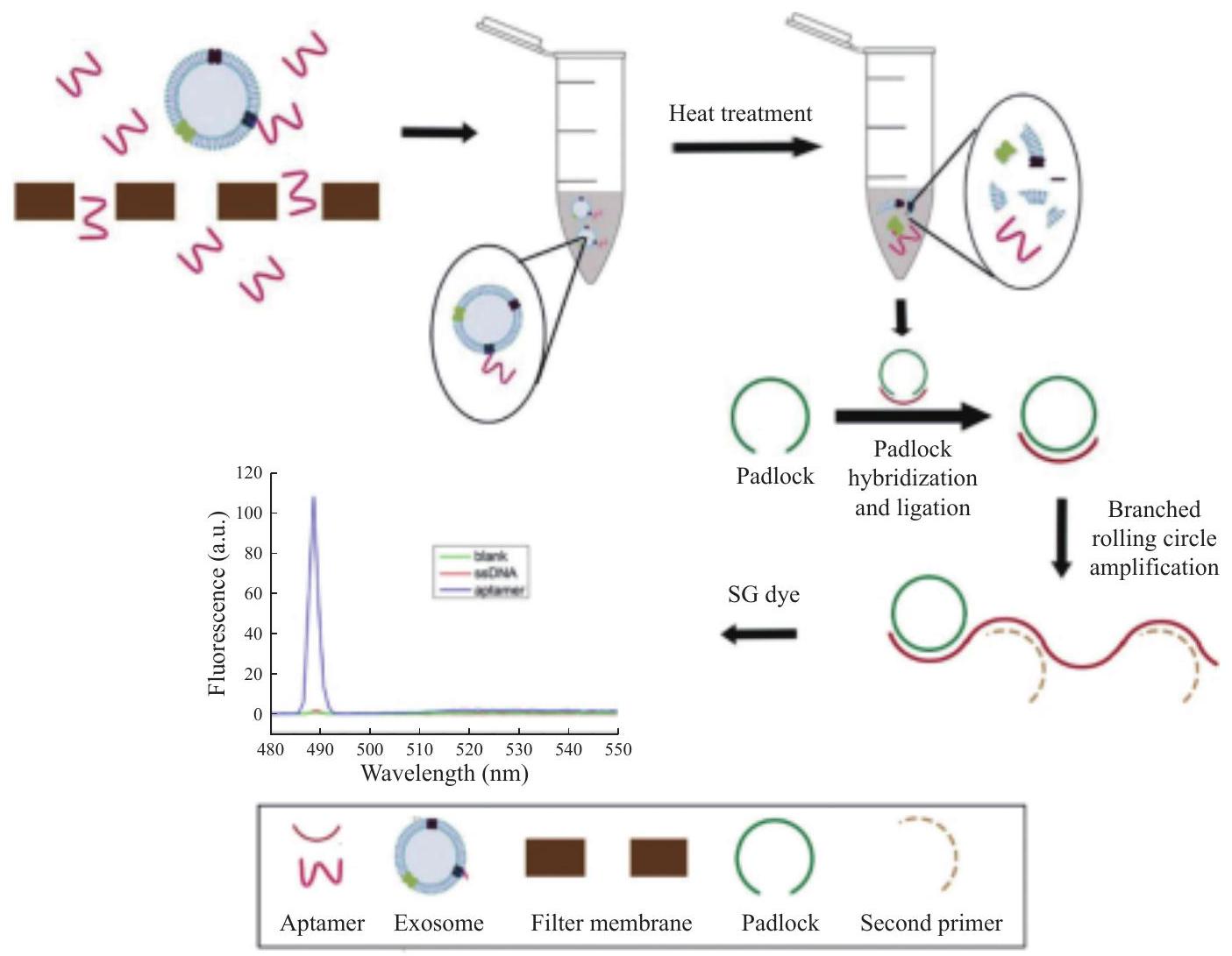 إكسوزومات سرطان المعدة. تم فحص أبتامر يرتبط بشكل محدد بالإكسوزومات التي تفرزها خلايا سرطان المعدة، وتم تصميم بروب قفل بطول 63 قاعدة مع الأبتامر كبروبي رابط. تم حضانة الأبتامر وإكسوزومات سرطان المعدة وتم إزالة الأبتامر غير المرتبط بواسطة البيريبلازم. تم إيلاء الأبتامر المرتبط وتم معالجته عند درجة حرارة عالية، وتفاعل الأبتامر المفصول مع بروب القفل لتشكيل قالب حلقي مغلق. في عملية التضخيم اللاحقة، تم إضافة بادئ ثانٍ بنفس التسلسل الجزئي لقالب الحلقة. بعد التهجين مع المنتج المضخم، يمكن أن يحفز البادئ تضخيم السلسلة المتفرعة ويشكل حمض نووي مزدوج الشريطة بتدرج في الطول. أخيرًا، حققنا الكشف الكمي عن إكسوزومات سرطان المعدة باستخدام الفلورية القوية لصبغة الحمض النووي SYBR Green I بالاشتراك مع منطقة الأخدود الحلزوني المزدوج للحمض النووي مزدوج الشريطة. كانت إشارة الفلورية للمنتج مرتبطة إيجابيًا بتركيز الإكسوزومات الأولي، وكانت الحساسية يمكن أن تصل إلى 1 إكسوزوم/مل.