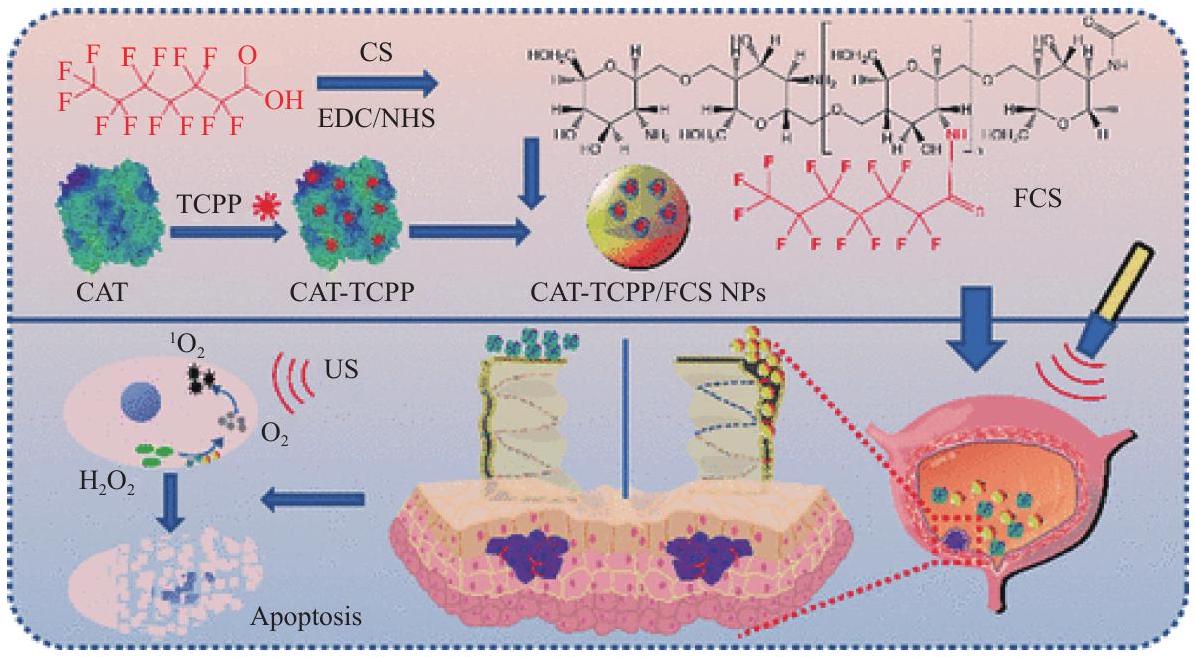 assembled by fluorinated chitosan with sonosensitizer meso-tetra(4-carboxyphenyl)porphine (TCPP)conjugated catalase (Fig. 9) to alleviate hypoxia in tumor tissue microenvironment by catalyzing tumor endogenous
