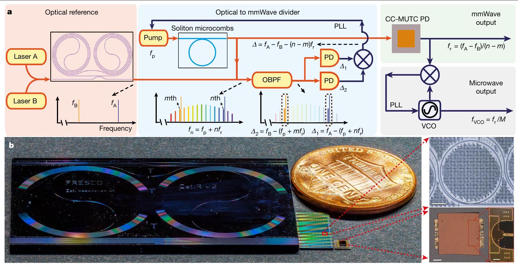 تم تطويره لتقسيم نطاق 100 جيجاهرتز من الموجات المليمترية إلى 20 جيجاهرتز من الموجات الدقيقة بشكل متماسك، والتي يمكن قياسها مباشرة على محلل ضوضاء الطور (الشكل 4أ).