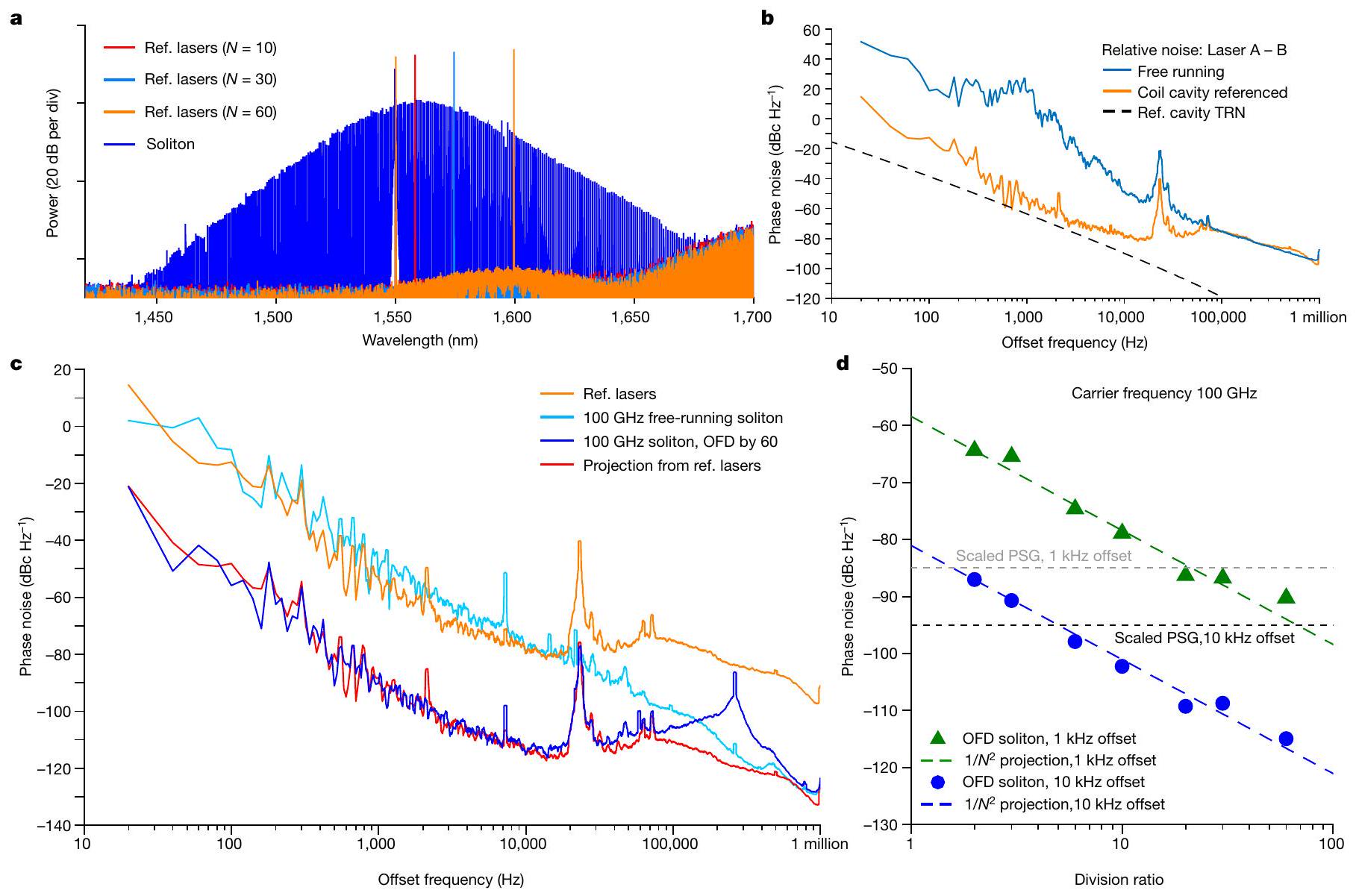 ميكروكومبز السوليتون الحرة (أزرق فاتح)، معدل تكرار السوليتون بعد OFD مع نسبة تقسيم 60 (أزرق) ومعدل التكرار المتوقع مع نسبة تقسيم 60 (أحمر). د، ضوضاء طور معدل تكرار السوليتون عند ترددات إزاحة 1 و10 كيلوهرتز مقابل نسبة تقسيم OFD. يتم عرض توقعات OFD بخطوط منقطة ملونة.