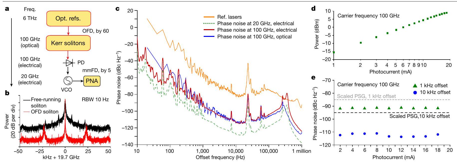 أخيرًا، يتم قياس ضوضاء الطور في الموجات المليمترية والطاقة مقابل تيار فوتو كاشف MUTC من 1 إلى 18.3 مللي أمبير عند جهد -2 فولت من خلال تغيير قوة الإضاءة الضوئية على الكاشف. على الرغم من أن الطاقة في الموجات المليمترية تزداد مع تيار الفوتو (الشكل 4د)، إلا أن ضوضاء الطور في الموجات المليمترية تبقى تقريبًا كما هي لجميع تيارات الفوتو المختلفة (الشكل 4هـ). وهذا يشير إلى أنه يمكن تحقيق ضوضاء طور منخفضة وطاقة عالية في نفس الوقت. الطاقة المحققة البالغة 9 ديسيبل ميلي واط هي واحدة من أعلى الطاقات التي تم الإبلاغ عنها على الإطلاق عند تردد 100 جيجاهرتز لمذبذبات ضوئية.