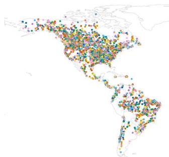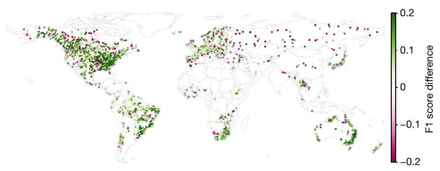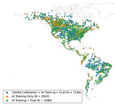 head-catchments to downstream catchments. All AI model evaluation was done out-of-sample in both location and time. Some of the 5,860 training gauges were excluded from evaluation because it was not possible to match those gauges to a GloFAS pixel. Basemap from GeoPandas