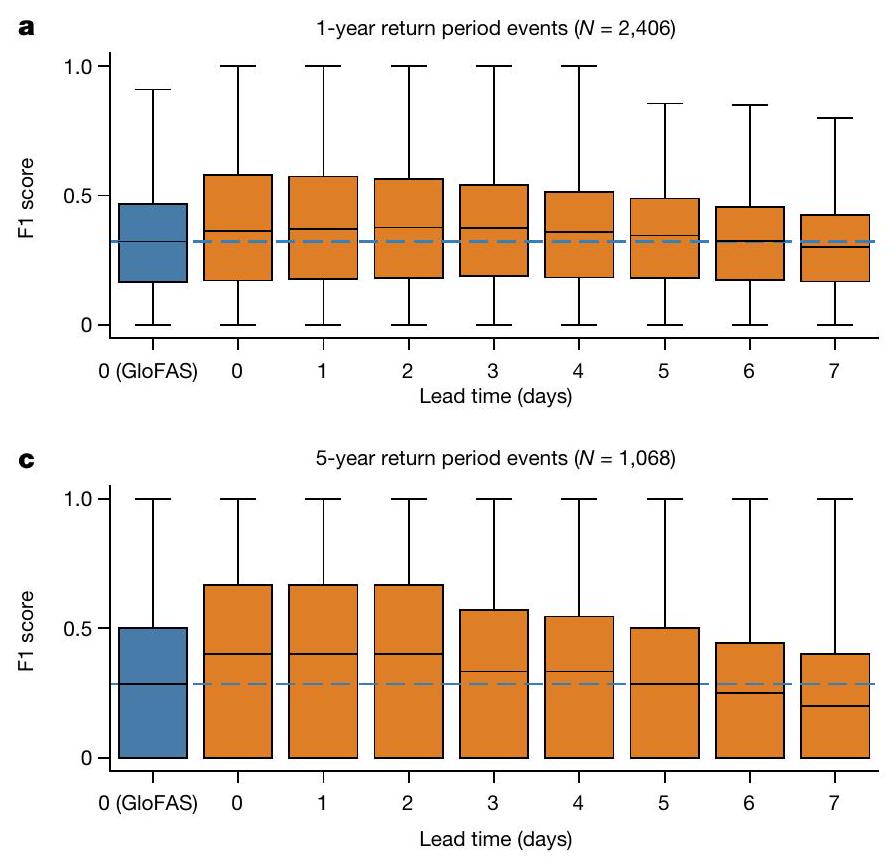 المبلغ عنه في النص الرئيسي. تُظهر الصناديق ربعيات التوزيع وتظهر الشعيرات النطاق الكامل باستثناء القيم الشاذة. الخط الأزرق المتقطع هو الدرجة الوسيطة لتنبؤات GloFAS ويتم رسمه كمرجع. بيانات محاكاة GloFAS من متجر بيانات المناخ