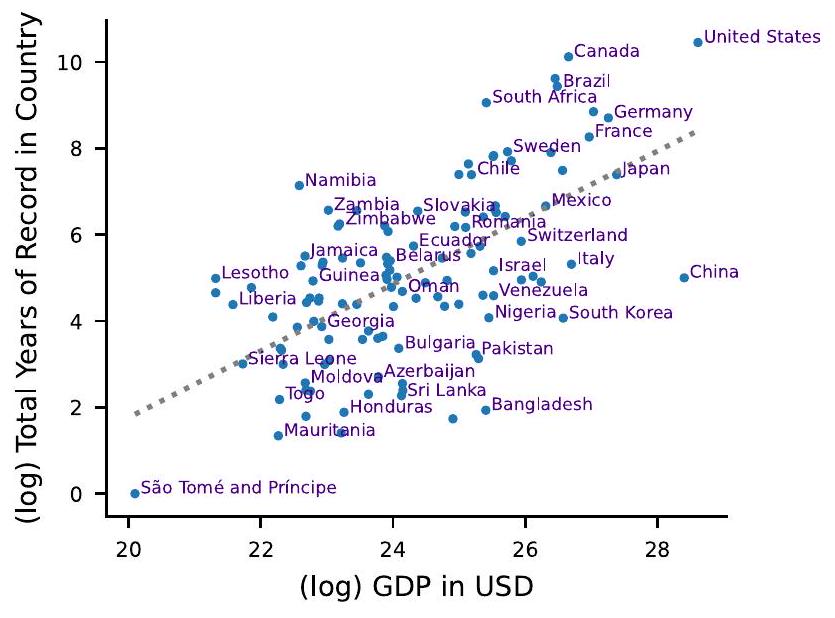 Domestic Product (GDP) and the total number of years worth of daily streamflow data available in a country from the Global Runoff Data Center. GDP data are sourced from The World Bank
