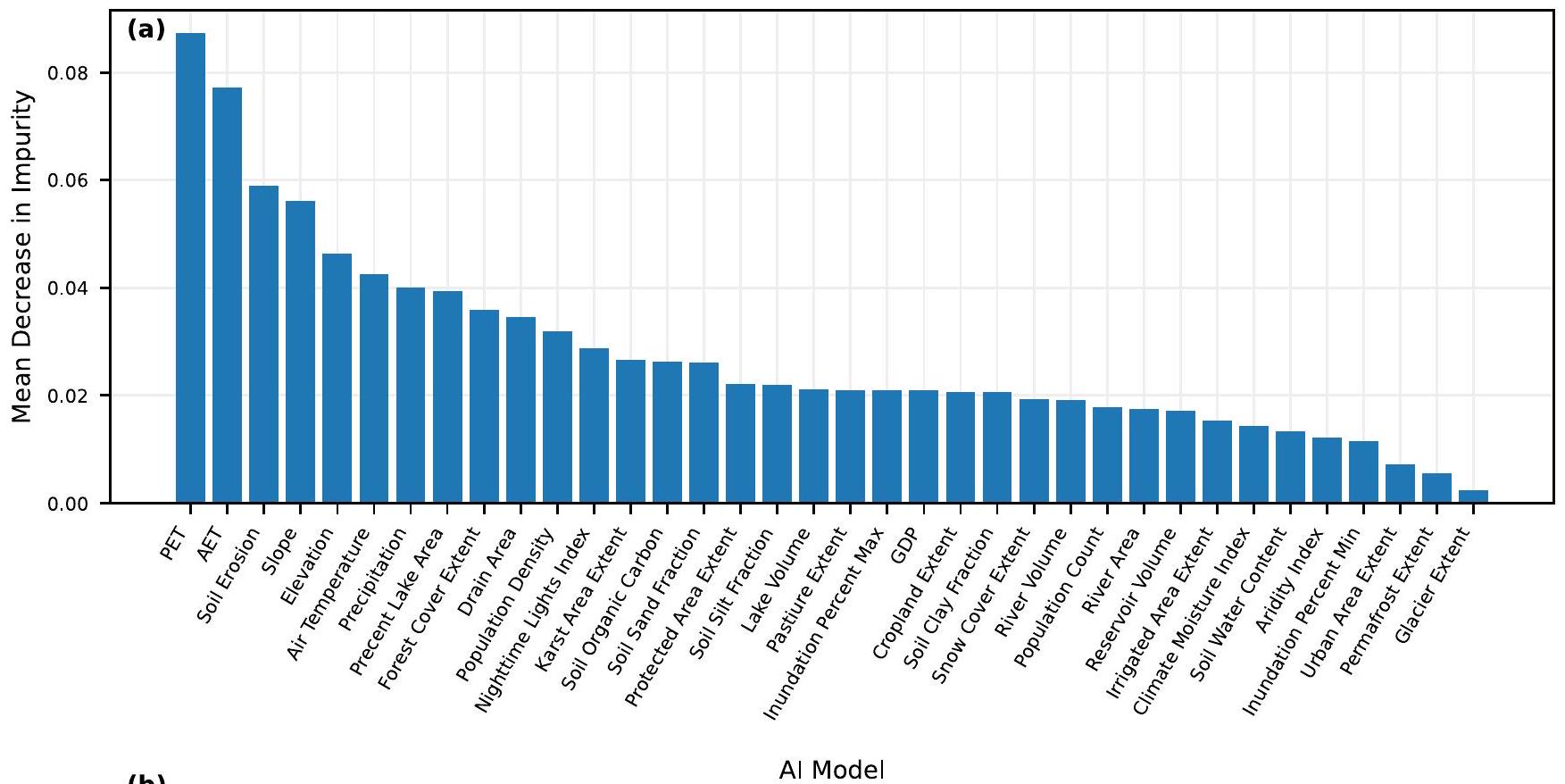 than average in any given gauge location. The feature importance rankings shown here illustrate which catchment attributes the classifier uses to make those predictions. GloFAS simulation data from the Climate Data Store