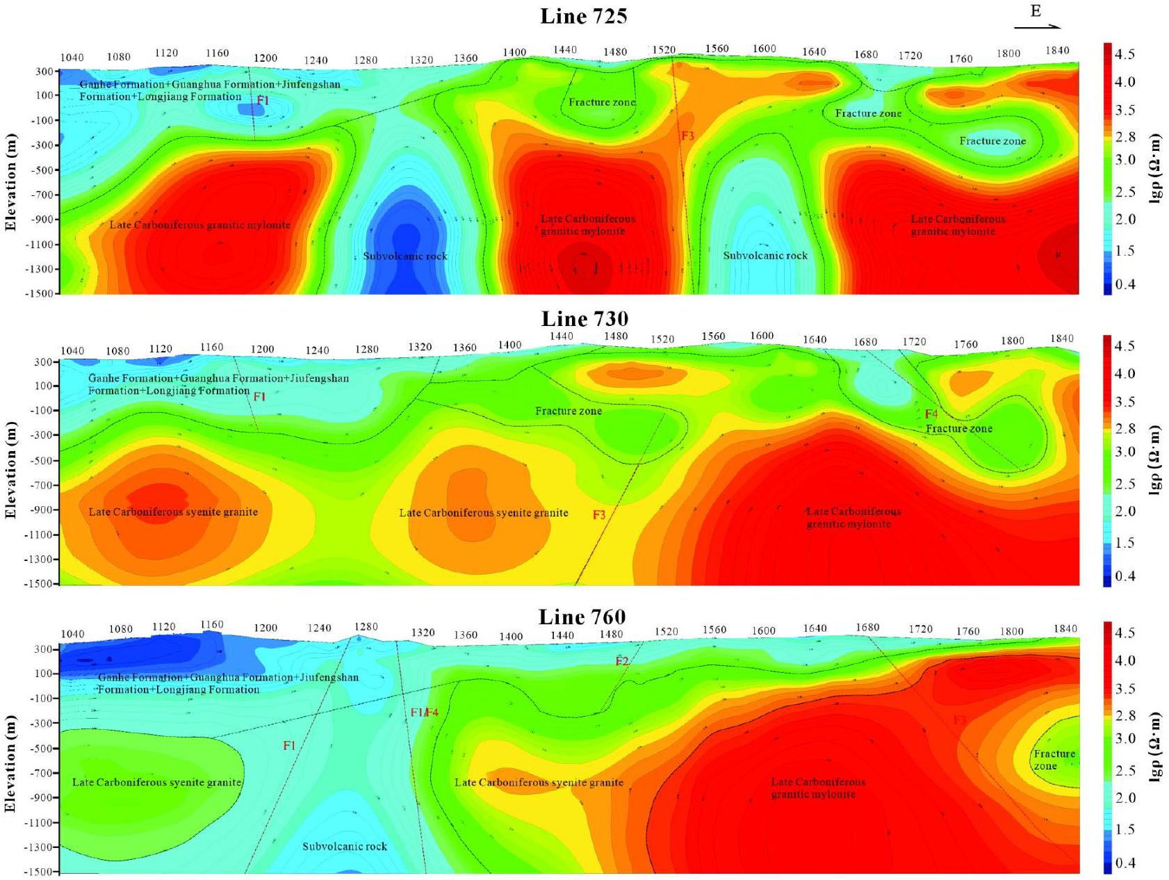 | خصائص جيولوجية جغرافية ملائمة للتعدين | تفسير الجيوفيزياء AMT (الشكل 9g) |