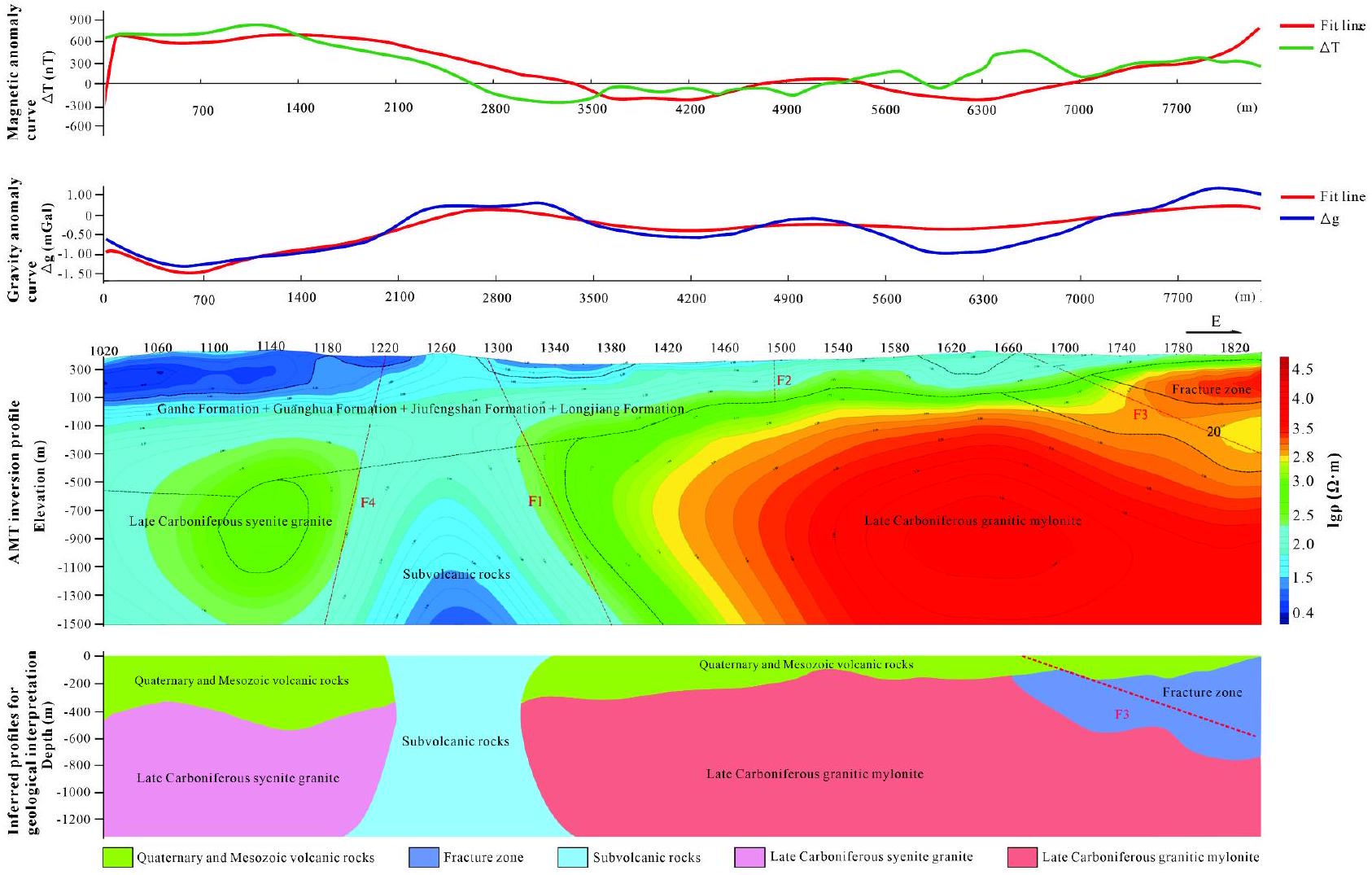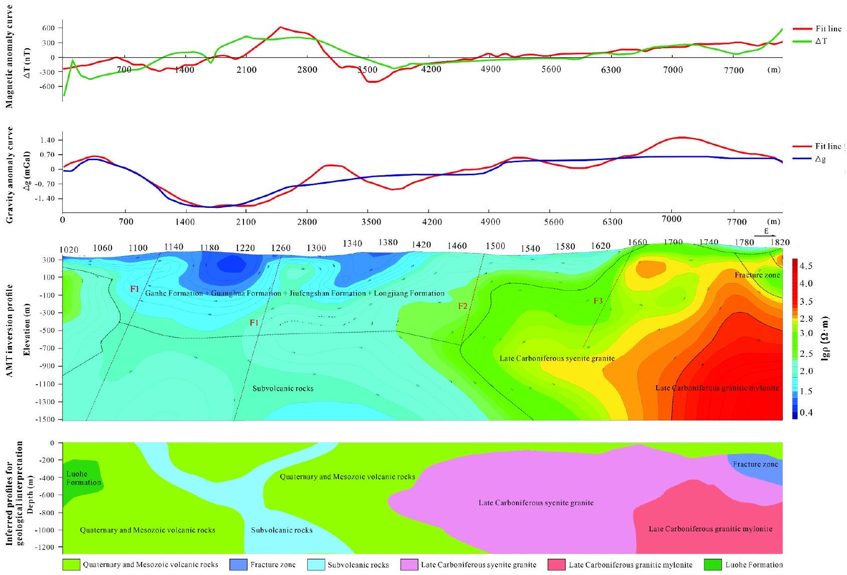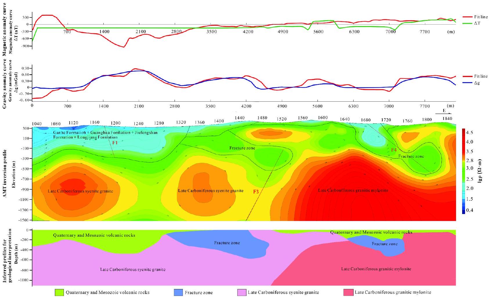 (2) This research innovatively integrates audio-frequency magnetotelluric (AMT) sounding, gravity surveys, and high-magnetic profiling, leveraging 3D modeling techniques to effectively identify lithological variations and deep ore-forming geological features within the study area. This approach demonstrates a highly efficient and comprehensive interpretation method.