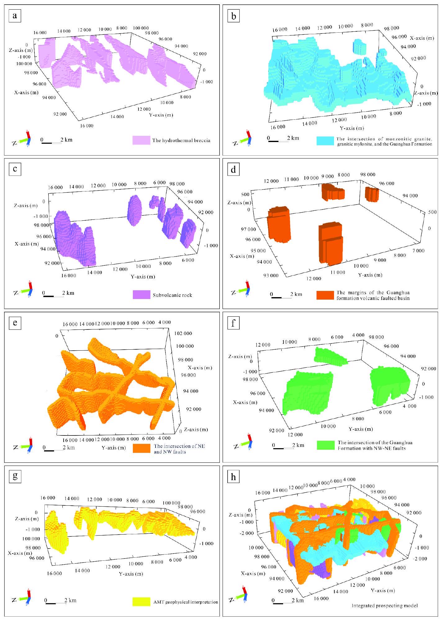 | Favorable mineralization structures | The intersection of NE and NW faults (Fig. 9e) | |