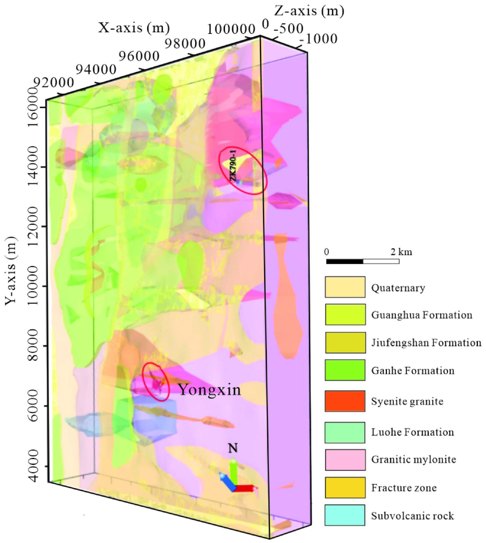 (3) من خلال بناء نموذج جيولوجي ثلاثي الأبعاد، حققنا “شفافية” الهيكل الجيولوجي ضمن نطاق عمق يبلغ 1.5 كم في منطقة الدراسة. من خلال دمج الظروف الجيولوجية المكونة للخامات مع نتائج التفسير الجيوفيزيائي، قمنا بتلخيص ظروف التمعدن المواتية لمنطقة تعدين الذهب يونغشين وطورنا نموذجًا شاملًا لاستكشاف الخامات. وقد أكدت التحقق من الحفر بنجاح على تحديد مناطق متعددة متمعدنة في العمق، مما يؤكد التآزر بين الاستكشاف الجيوفيزيائي المتكامل.
